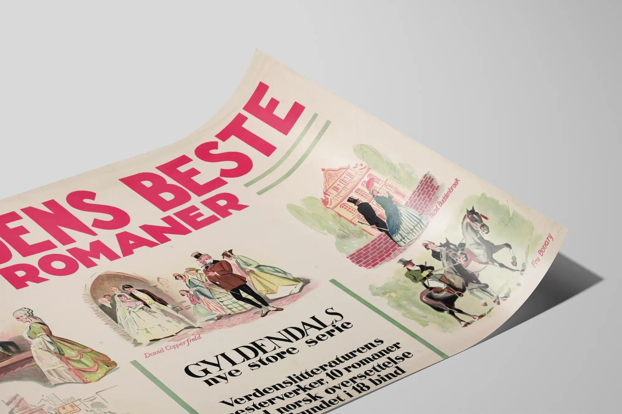 Julisteen keskellä useat värikkäät kuvitukset kuvaavat kohtauksia tunnetuista romaaneista kuten "Gösta Berlings saga", "David Copperfield", "Huset Buddenbrook", "Quo Vadis?" ja "Fru Bovary". Jokainen kuvake erottuu vintage-tyylillään, joka muistuttaa aikakautta, jolloin nämä merkittävät teokset vaikuttivat maailman kirjallisuuteen. Nämä tarinalliset kuvat kuvaavat sekä dramaattisia hetkiä että rauhallisempia kohtauksia, tarjoten elävän ja houkuttelevan katsauksen näihin mestariteoksiin.