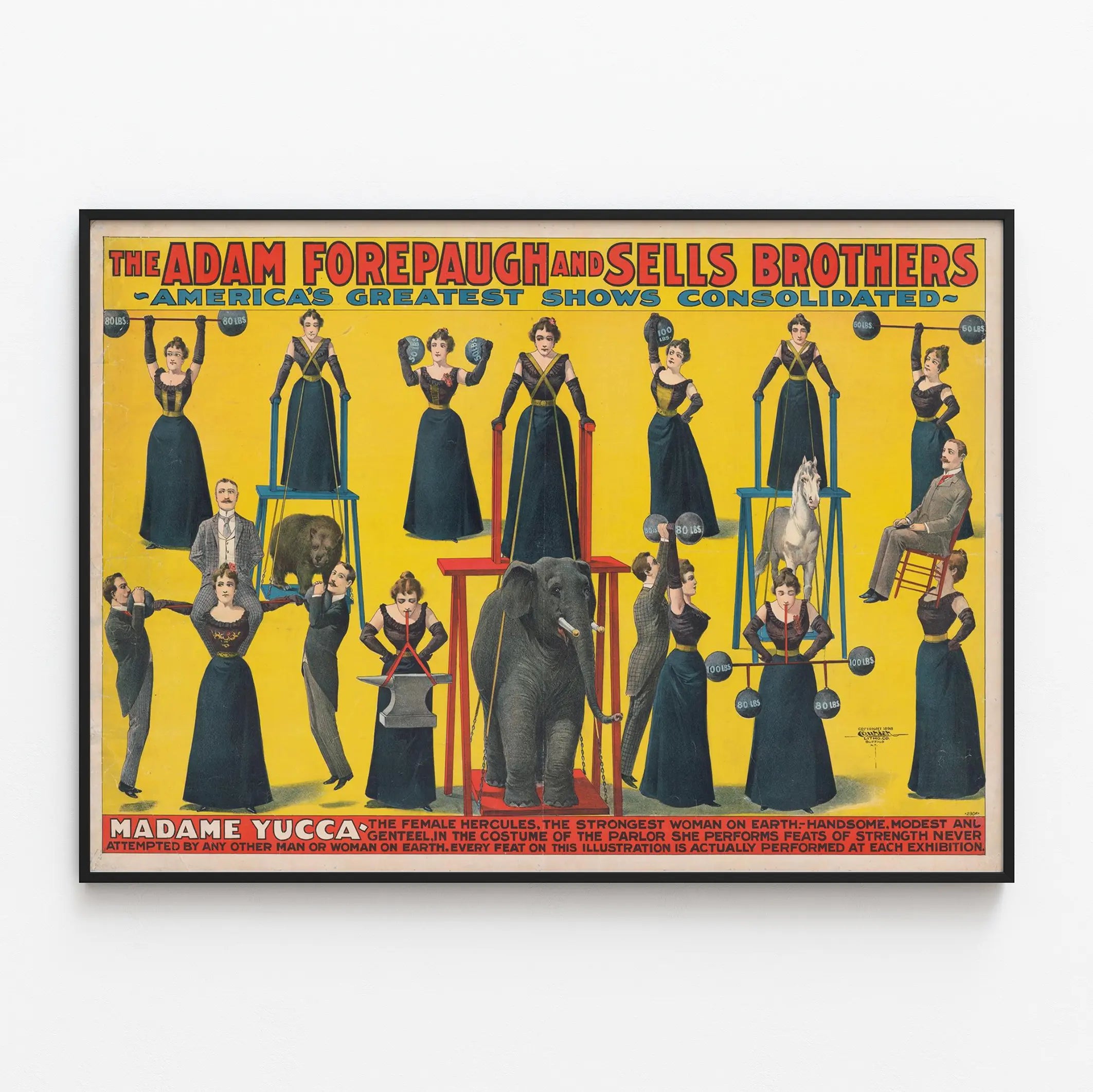 Tämä vaikuttava vintage-plakaatti esittelee Madame Yuccan, joka tunnetaan nimellä « Nainen Herkules », ja hänet tunnustetaan maailman vahvimmaksi naiseksi. Tämä värikäs ja yksityiskohtainen kuvaus vangitsee amerikkalaisten menneiden show’iden upean hengen, esittäen Madame Yuccan useissa vaikuttavissa voimannäytöksissä. Täydellinen ainutlaatuisen seinäkoristeen luomiseen, tämä retroplakaatti yhdistää elävän grafiikan keltaisella taustalla ja sarjan dynaamisia poseerauksia, joissa Madame Yucca nostaa painoja, eläimiä kuten karhu ja norsu, sekä suorittaa erilaisia fyysisiä esityksiä. Tämä juliste viittaa 1800-luvun suosittuihin messuihin ja esityksiin, joissa voimannäytöt olivat sekä viihdettä että poikkeuksellisen voiman symboli. Monet tämän julisteen kuvat, joissa painot on merkitty paunoina, korostavat Madame Yuccan poikkeuksellista voimaa, kun taas tyylikkäät puvut antavat hänelle vaatimattoman ja arvokkaan ilmeen. Täydellinen epätavallisen ja vintage-tyylisen seinäkoristeen ystäville, tämä painettu taulu tuo sisätiloihin ripauksen historiaa ja rohkeutta. Olipa kyse olohuoneesta, toimistosta tai kokoelmanäyttelystä, tämä juliste toimii sekä vahvana graafisena elementtinä että visuaalisena kertomuksena. Kuvan laatu, kontrastivärit ja huolelliset yksityiskohdat rikastuttavat tätä koriste-esinettä, tehden siitä yhtä houkuttelevan kuin opettavaisen. Viittaus kuuluisiin esityksen järjestäjiin Adam Forepaughiin ja Sells Brothersiin juurruttaa tämän julisteen viihteen historialliseen kontekstiin. Yhteenvetona, tämä vintage Madame Yucca -koristejuliste on kiehtova teos, joka juhlistaa naiseuden voimaa tyypillisellä 1800-luvun lopun graafisella tyylillä, ja se on ihanteellinen kaikille, jotka haluavat sisustukseensa historian ja energian täyteisen elementin.