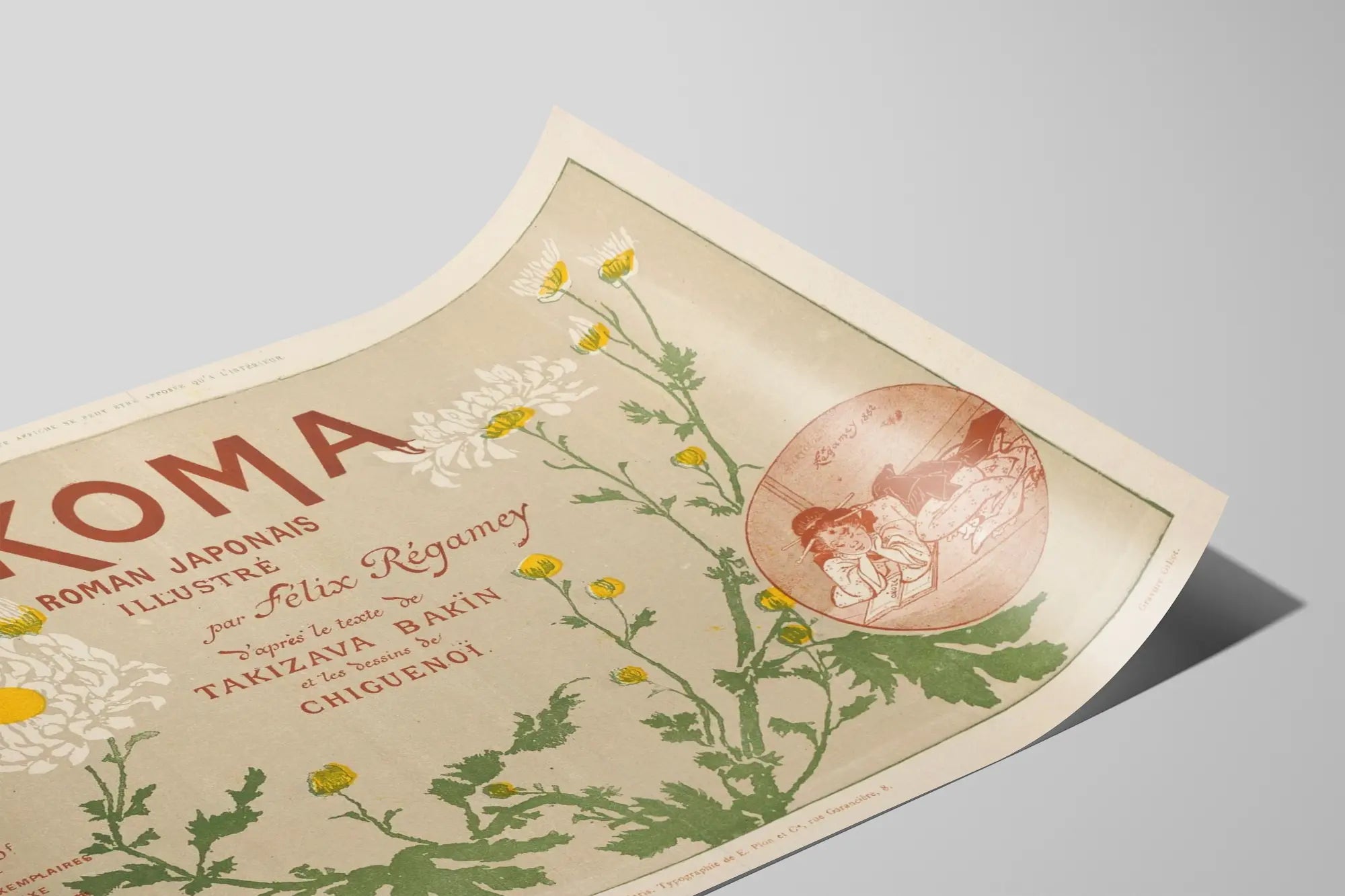 Tutustu tähän vintage-plakaattiin nimeltä "OKOMA", joka esittelee tyylikkään ja hienostuneen seinäkoristeen, inspiroituneena japanilaisesta kuvakirjasta. Tämä herkästi graafinen juliste korostaa värikkäitä kukkakuvioita vihreissä, keltaisissa ja valkoisissa sävyissä, huolellisesti ja harmonisesti koostettuna, mikä ylittää ajan rajat. Vanhan typografian käsin kirjoitettu teksti lisää aitouden ja historian tuntua tähän koriste-esineeseen. Se korostaa Félix Régameyn taiteellista työtä, perustuen Takizava Bakïn:n tekstiin ja Chiguenoin piirroksiin, vahvistaen sen vetovoimaa japanilaisesta kulttuurista ja retro-suunnittelusta kiinnostuneiden keskuudessa. Tämä juliste on täydellinen koriste-elementti tuomaan eleganssia ja eksoottisuutta sisätiloihisi, olipa kyseessä olohuone, toimisto tai kirjasto. Sen ainutlaatuinen taiteellinen tyyli, yhdistäen vesivärit ja kaiverrukset, rikastuttaa sisustustasi inspiroivalla ja kulttuurillisella ilmapiirillä. Tämä seinäkoriste on myös erinomainen vaihtoehto vanhojen kuvakirjojen, japanilaisen taiteen tai vintage-klassikoiden ystäville. Se edustaa hienovaraista yhdistelmää tekstin ja kuvituksen välillä, tarjoten visuaalisen kokemuksen yhtä lailla kuin pelkän koristeen, joka vangitsee katseen ja herättää mielikuvituksen. "OKOMA" -juliste on kutsu sukeltaa poikkeukselliseen kirjalliseen ja graafiseen maailmaan, lisäten harvinaisen ja esteettisen teoksen kokoelmaasi julisteista ja koristeplakaateista.