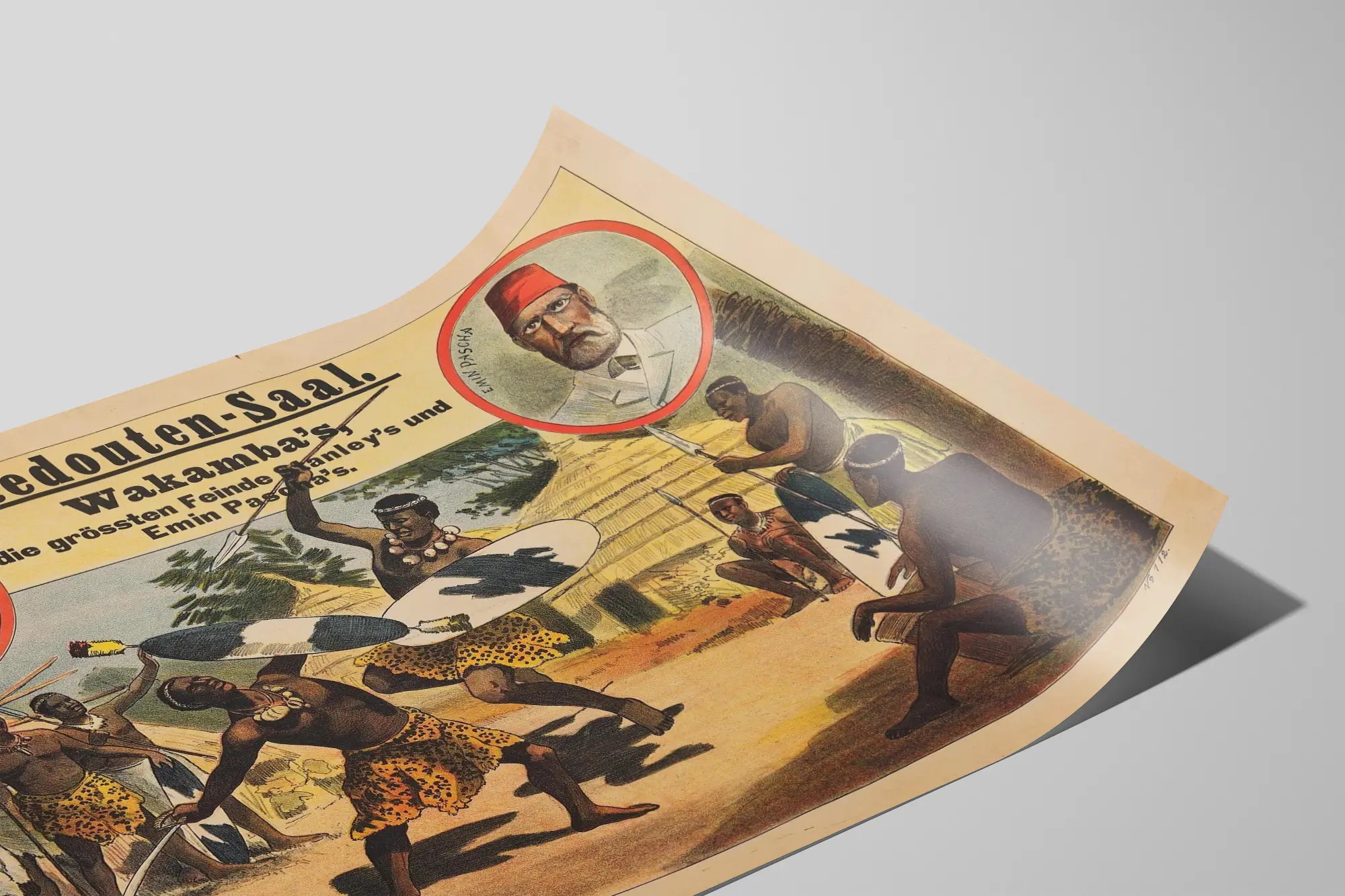 Tuoda sisustukseesi ripaus historiaa tämän vintage- julisteen nimeltä «Redouten-Saal Wakambas», poikkeuksellinen juliste, joka kuvaa kohtaustilannetta Wakamba-ryhmien ja historiallisten henkilöiden Stanley ja Emin Pachan välillä. Tämä seinäkoriste erottuu vanhan estetiikkansa ja XIX-luvun julisteille tyypillisen graafisen tyylinsä ansiosta, täydellinen historian ja kulttuurin harrastajille.
