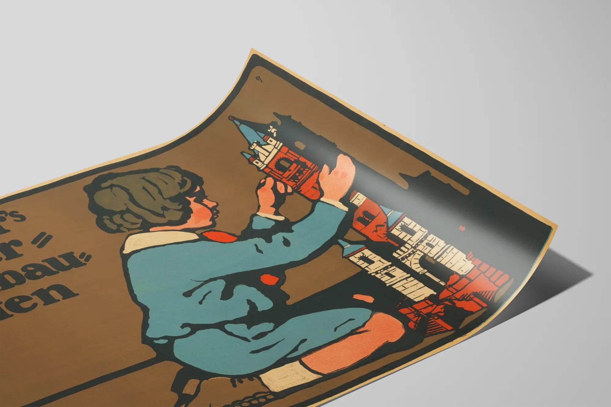 Tämä kiehtova vintage- juliste esittelee lapsen, joka pukeutuneena siniseen pukuun, leikkimässä kivikartanoa Richter's Anker Steinbaukasten -rakennuspelin avulla. Graafinen tyyli, jossa hallitsevat ruskean, sinisen ja punaisen sävyt, antaa tälle julisteelle viehättävän retro-tyylisen ilmeen, sopivan ainutlaatuiseksi seinäkoristeeksi. Lapsi on kuvattu sivuprofiilissa, keskittyneenä huolellisesti kivipalkkien kokoamiseen, jotka muodostavat rakennelman. Nämä kivet on yksityiskohtaisesti kuvattu, ja niissä näkyvät arkkitehtoniset elementit kuten kaaret, torneja ja portaat, mikä korostaa pelin opetuksellista ja luovaa luonnetta. Julisteessa on paksuja mustia kirjaimia, jotka muistuttavat sen luomisajasta, ja siinä on myös logo, jossa on punainen ankkuri mustalla taustalla, symboloiden Richter's Anker -merkkiä. Tämä seinäkoriste on erityisen suosittu vanhan graafisen taiteen harrastajien ja perinteisten rakennuspelien ystävien keskuudessa. Se voi tyylikkäästi koristaa lastenhuoneen seinää tai nostalgian ja vintage-tyylin olohuonetta. Sen yksinkertainen graafinen ilme ja hillityt värit tuovat lämpöä ja leikkisyyttä sisätiloihin. Lisäksi tämä juliste viittaa kokoelman rakentelupelien maailmaan, jotka stimuloivat lasten luovuutta ja motoriikkaa. Se muistuttaa opetuksellisten lelujen tärkeydestä keskittymiskyvyn ja kärsivällisyyden kehittämisessä. Yhteenvetona, tämä Richter's Anker Steinbaukasten -juliste on ainutlaatuinen seinäkoriste, joka yhdistää retro- estetiikan ja kunnianosoituksen kivipohjaiselle opetuspeli-klassikolle. Se on täydellinen rikastuttamaan graafisten taidejulisteiden kokoelmaa tai personoimaan leikkiin ja oppimiseen omistetun tilan, ja se erottuu tyylillään ja aiheensa herättävällä kuvastolla.