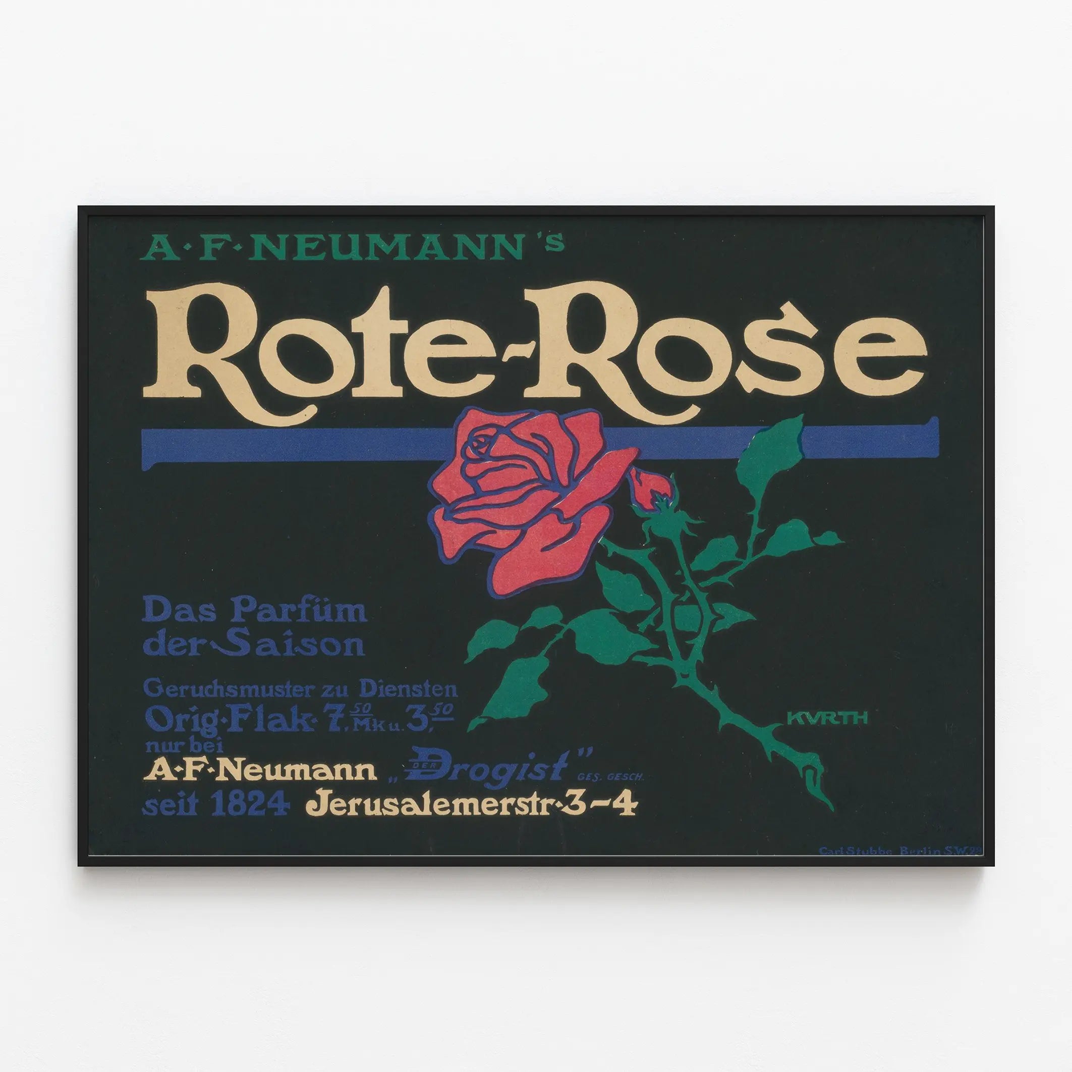 Tutustu tähän vintage-plakaattiin nimeltä "Rote Rose", taiteellinen teos, joka on omistettu kauden tuoksun mainostamiseen. Tämä mainosjuliste esittelee tyylikkään ja yksinkertaisen muotoilun, jossa korostuu tyylitelty punainen ruusu yhdistettynä erottuvaan typografiseen tekstiin. Pääkuvio on kirkkaanpunainen ruusu, jossa on tummanvihreät lehdet ja varret, ja se muodostaa harmonisen kontrastin mustalla taustalla. Saksankielinen teksti sisältää tuotteen nimen "A.F. Neumann's Rote Rose" sekä lisätietoja kuten "Das Parfum der Saison", mikä tarkoittaa "Kauden tuoksu". Tämä juliste on erinomainen seinäkoriste vintage-taiteen ja vanhojen mainosten ystäville. Se voi koristaa sisätiloja tuoden niihin ripauksen retro-tyylin eleganssia ja historiallista charmia, joka on tyypillistä 1900-luvun alun kuvitetyille julisteille. Tämä ainutlaatuinen seinäkoriste sopii eri tiloihin, kuten olohuoneeseen, myymälään tai tuoksujen tilaan, tarjoten sekä nostalgisen että hienostuneen visuaalisen ilmeen. Juliste leikkii voimakkaiden värikontrastien kanssa: punainen, vihreä, sininen ja beige, jotka on harmonisesti sovitettu tummalle taustalle. Tämä juliste on arvostettu yksinkertaisesta graafisesta tyylistään ja selkeästä viestistään, joka liittyy tuoksutuotteeseen, tehden siitä ihanteellisen koriste-esineen vintage-mainonnan ja retro-designin harrastajille. Ota tämä juliste seinätauluksi ja korosta seiniesi sisustusta visuaalilla, joka on yhtä houkutteleva kuin ajaton.