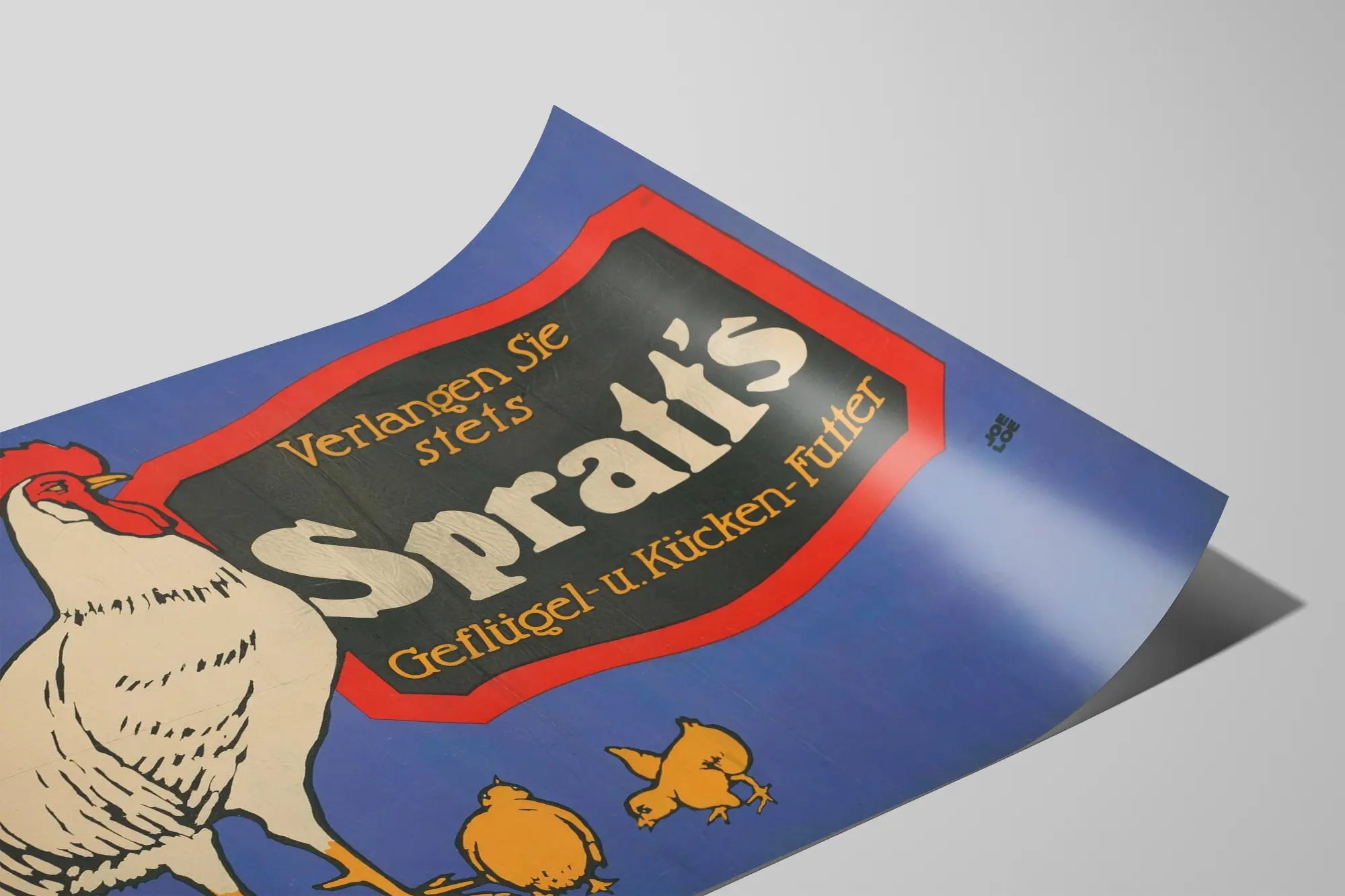 Tämä vintage- juliste esittelee mainoksen Spratt's-ruoasta, joka on tarkoitettu siipikarjalle ja poikasille. Yksinkertaisella mutta vaikuttavalla graafisella tyylillään se korostaa valkoista kukkoa, jota ympäröivät pienet keltaiset poikaset, tuoden esiin sopivan ravinnon tärkeyden näille eläimille. Tummansininen tausta sopii harmonisesti tekstin kehyksen punaisen ja mustan kanssa, luoden voimakkaan visuaalisen kontrastin ja houkuttelevan kokonaisuuden seinäkoristeisiin. Joe Loen signeeraama juliste on kaunis esimerkki vanhasta mainoksesta, ihanteellinen retro- julisteiden ja alkuperäisten seinäkoristeiden harrastajille. Tämä juliste lisää aitouden ja rustiikkisen viehätyksen tunnelmaa mihin tahansa sisätilaan, sopien täydellisesti keittiöön, ruokasaliin tai maatalouteen ja maatilaan liittyvään tilaan. Seinäkoristeena se sopii helposti vintage- tai maalaisromanttiseen tunnelmaan, tuoden lämpöä ja ystävällisyyttä. Yksinkertaiset graafiset yksityiskohdat ja primaarivärit luovat vaikuttavan ja helposti yhdistettävän visuaalisen kokonaisuuden muiden koriste-esineiden kanssa. Tämä mainosjuliste on täydellinen valinta niille, jotka haluavat rikastuttaa seinäkoristettaan esteettisellä ja tarinallisesti rikkaalla julisteella. Olipa tarkoituksena esitellä maatalouteen liittyvässä liikkeessä tai vain koristella seinää retro-tyylisellä julisteella, tämä juliste on kutsu uudelleen löytää vintage- mainonnan taidetta siipikarjan alalla.