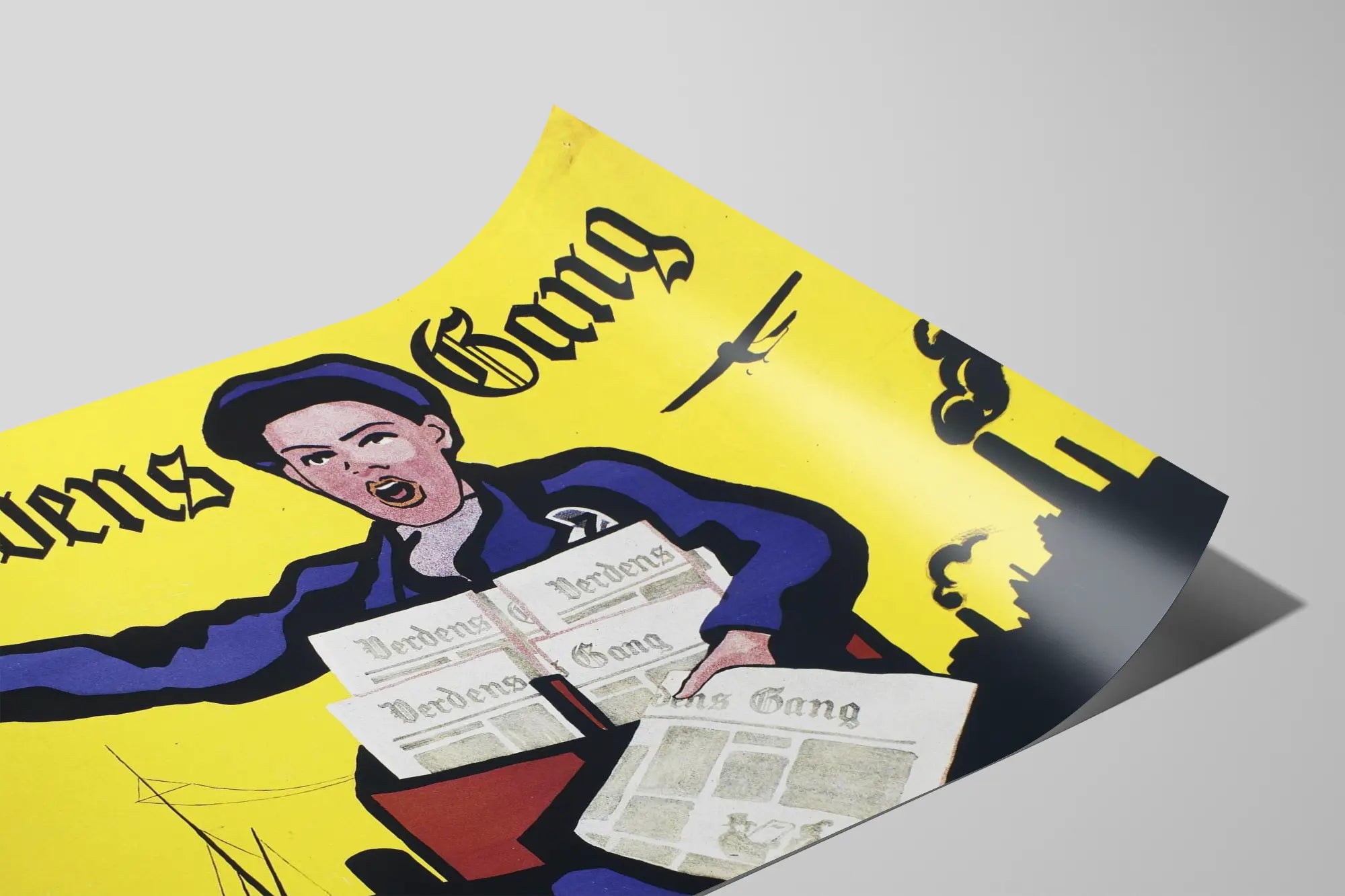 Tämä vintage juliste nimeltä "Verdens Gang" on ainutlaatuinen seinäkoriste, joka sopii erinomaisesti lisäämään ripauksen retroa ja graafista tyyliä sisustukseesi. Esittäen sanomalehtimyyjän toimintatilanteessa, tämä dynaaminen kuva korostuu kirkkaan keltaisella taustalla, joka vangitsee heti huomion. Keskellä oleva hahmo, pukeutuneena tummiin univormuihin ja päähänsä asetettuun berettiin, pitää useita saman sanomalehden kappaleita, joiden goottilaisin kirjaimin kirjoitettu otsikko "Verdens Gang" näkyy julisteen yläosassa. Tämä typografinen valinta vahvistaa julisteen vanhanaikaista ja aitoa tyyliä.
