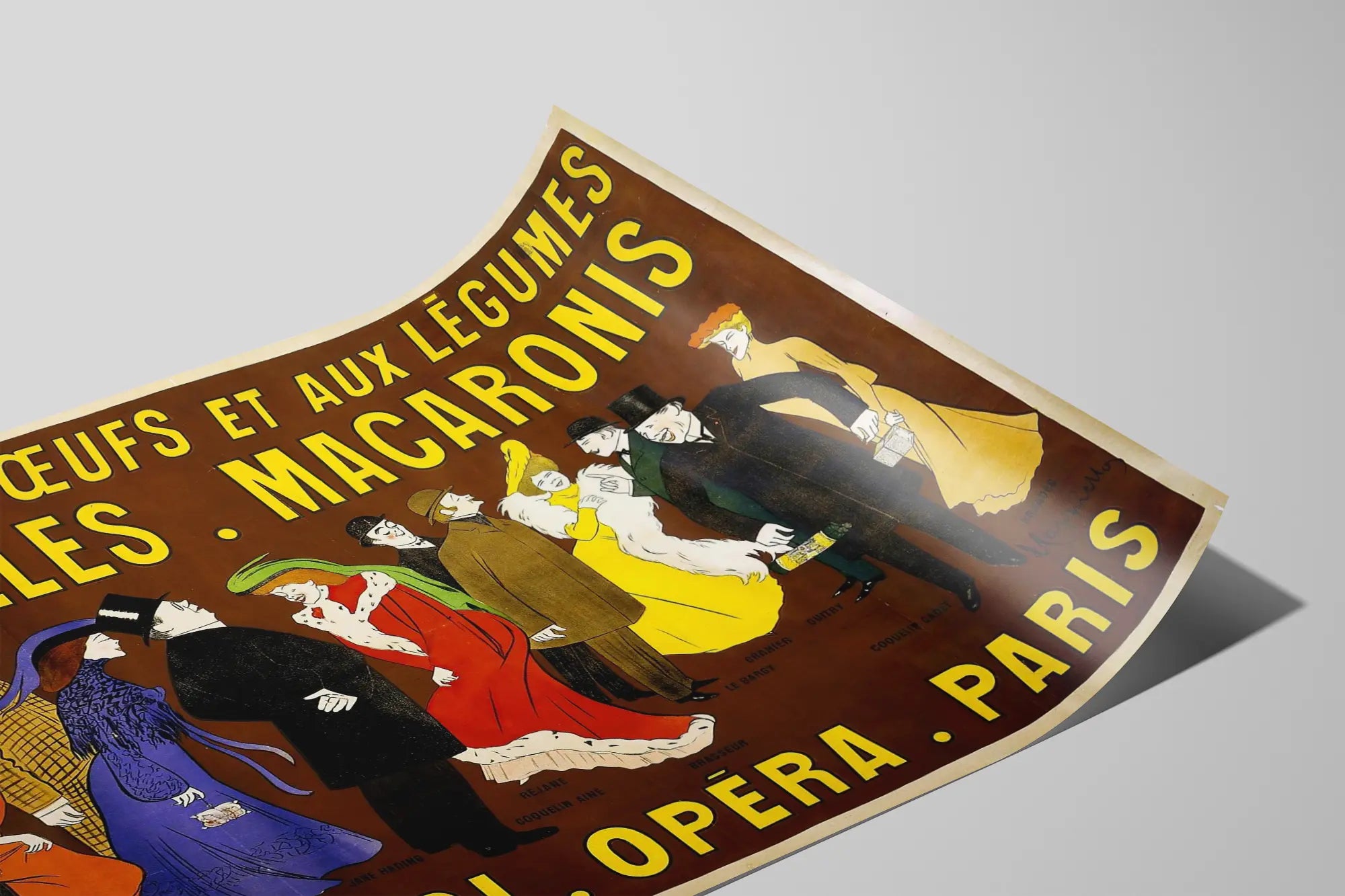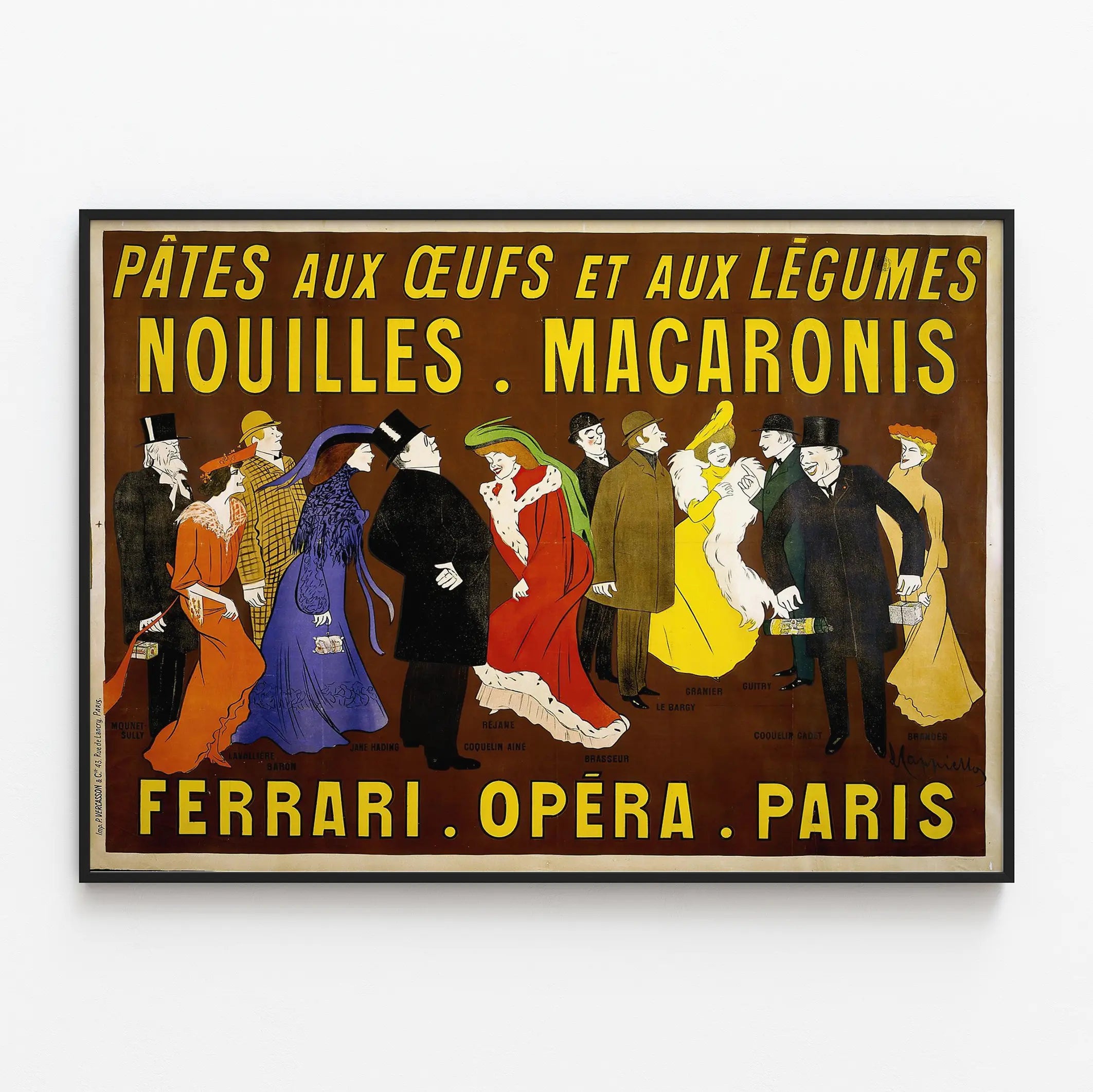Lisää ripaus retro-tyylin eleganssia seinäkoristeluusi tämän Maurice Mapiellonin signeeraaman vintage-plakatin avulla. Tämä juliste korostaa tyylikkäästi munapastaa ja kasvispastaa, erityisesti nuudeleita ja makaronia. Muotoilu ammentaa vaikutteita 1900-luvun alun taiteellisista julisteista, esittäen viehättävän kohtauksen, jossa useat ajan henkeä huokuivat henkilöt pukeutuneina tyylikkäästi seisovat rinnakkain ystävällisessä ja juhlallisessa ilmapiirissä. Tämä värikäs kokonaisuus, jossa hallitsevat lämpimät sävyt ja ruskea tausta, on täydellinen koriste-elementti keittiöön, ravintolaan tai ruokailutilaan, tuoden tilaan sekä luonnetta että aitoutta. Keltaiset, isoilla kirjaimilla kirjoitetut sanat vangitsevat heti katseen, vahvistaen tämän typografisen ja graafisen teoksen visuaalista vaikutusta. Ajattoman tyylinsä ansiosta tämä seinäkoriste herättää mielikuvan sekä ranskalaisesta gastronomiasta että menneen Pariisin viehätyksestä. Olipa tarkoituksena uudistaa sisätilojen sisustusta tai koristella herkutteluun omistettua nurkkaa, tämä juliste kutsuu juhlimaan klassista ja hienostunutta keittiötaidetta. Anna seinillesi ajan hengen mainosmainen ilme, omaleimainen ja täynnä luonnetta, joka vangitsee huomion ja sulautuu harmonisesti nykyaikaiseen tai vintage-tyyliseen sisustukseen.