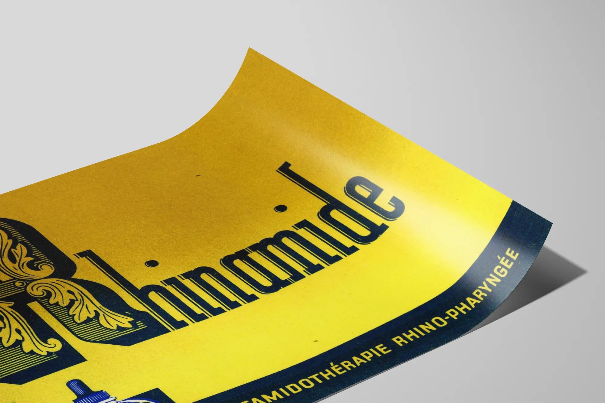 Tutustu tähän vintage- julisteeseen, joka esittelee rhinamide-tuotteen mainosta, käytettynä nenäsulfaidihoidossa. Tämä retro-tyylinen seinäkoriste korostaa yksityiskohtaista pulloa, joka esittää lääkettä, ja typografinen muotoilu, jossa on suuri « R »-kirjain koristeltu kasviaihein, luo vanhan ja elegantin ilmeen. Juliste leikkii kullanhohtoisen keltaisen ja mustan väriyhdistelmän kontrastilla, mikä tehostaa tekstin luettavuutta ja visuaalista vaikutelmaa kokonaisuudessaan. Tämä juliste erottuu graafiselta koostumukseltaan, joka muistuttaa vanhoja lääkeilmoituksia, ja sopii täydellisesti teemalliseen tai vintage- seinäkoristukseen. Täydellinen elävöittämään lääketieteellistä tilaa, vanhaa apteekkia tai retro-tyylistä sisustusta, tämä juliste tuo aitouden ja omaleimaisuuden vivahteen. Selkeä maininta « nenäsulfaidihoito » sekä tuotteen koostumustiedot (sulfaamiini, efedriini, elykaïni) asettavat tämän julisteen keräilyesineeksi tai koriste-esineeksi, joka on suunnattu historian ja lääketieteen muotoilun harrastajille. Lisää persoonallisuutta ja ainutlaatuista tunnelmaa seinillesi tämän vintage- rhinamide-mainosjulisteen avulla, jossa yhdistyvät koristeellinen typografia, tarkka kuva ja hillitty mutta vaikuttava väripaletti. Seinätaideteos, joka herättää huomiota ja rikastuttaa elin- tai työtilojasi estetiikallaan ja vaikuttavalla visuaalisella sisällöllään.