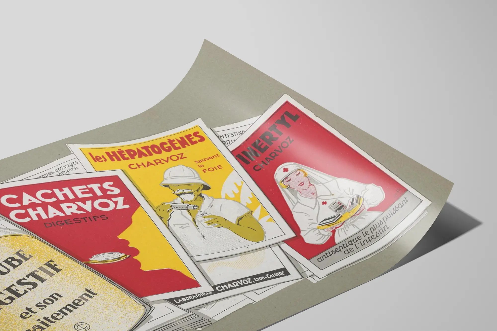 Tutustu tähän vintage-mainokseen, joka esittää kokoelman vanhoja lääketieteellisiä asiakirjoja, jotka liittyvät ruuansulatuskanavaan ja sen hoitoon. Tämä seinäkoriste kuvaa useita mainoksia Charvoz-merkistä, joka on erikoistunut ruoansulatus- ja maksahäiriöiden hoitoon. Tässä julisteessa on erityisesti mainoksia "Charvoz-ruoansulatuskapseleista", "Charvoz-hepatoigeista", jotka on esitetty tehokkaiksi maksalle, sekä "Linertyl Charvoz" - antiseptinen aine suolistolle. Jokainen asiakirja on täynnä kirkkaita värejä, kuten kirkkaan punaista, kirkasta keltaista ja kontrastista valkoista, tarjoten dynaamisen ja aidoilta vaikuttavan visuaalisen vaikutelman. Koko kokonaisuus on aseteltu neutraalille taustalle, korostaen näitä vanhoja painettuja materiaaleja, jotka viittaavat 1900-luvun alun lääketieteellisiin kampanjoihin. Tämä juliste on ihanteellinen ainutlaatuisen seinäkoristeen luomiseen lääketieteellisessä vastaanotossa, apteekissa tai jopa retro-tyylisten esineiden ja julisteiden harrastajille, jotka ovat kiinnostuneita terveydestä ja ihmiskehosta. Graafinen tyyli yhdistää kuvituksia ja vahvoja typografioita, muistuttaen menneisyyden markkinointia, joka keskittyi ruuansulatusjärjestelmän hoitoon. Anna seinillesi ripaus lääketieteellistä historiaa tämän vintage-julisteen kautta, joka myös viittaa retro-tyylin ja mainostaiteen ystäviin.