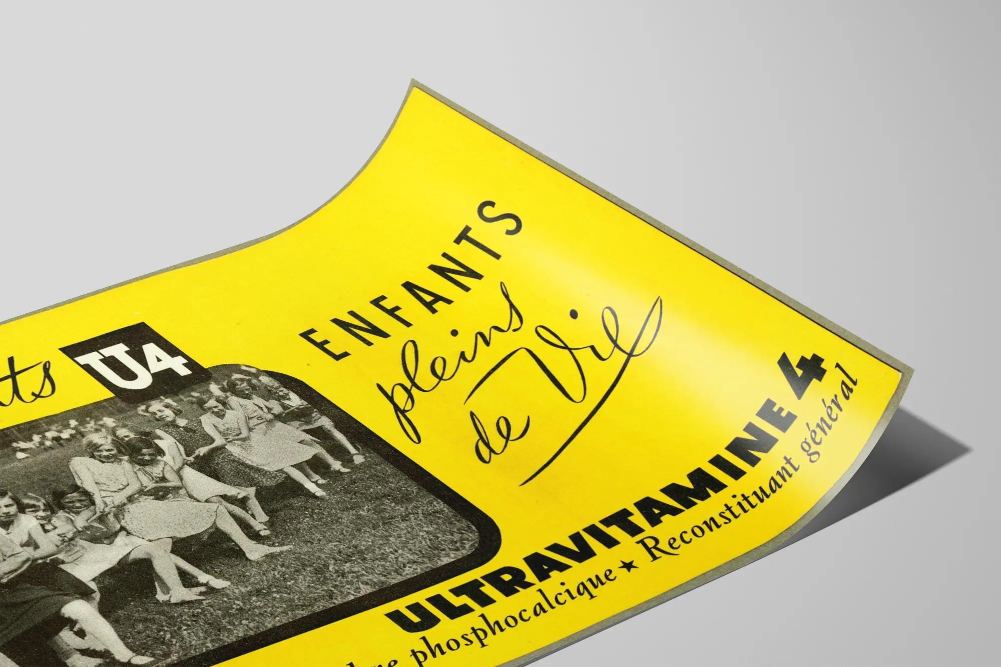 Tämä vintage juliste Ultraviamine 4 on ainutlaatuinen seinäkoriste, joka tuo kotiisi aitoa tunnelmaa ja retroa charmia. Kirkkaan keltaisella taustalla juliste esittää mustavalkoisen valokuvan lapsista yhteisleikkien keskellä, symboloiden iloa ja elinvoimaa. Teksti "Elävät lapset" kirjoitettuna tyylikkäällä käsin kirjoitetulla fontilla viittaa terveyteen ja voimaan, ja sitä vahvistaa maininta "Ultraviamine 4", joka viittaa vitamiinivalmisteeseen, tarkoituksenaan tasapainottaa fosfori-kalsiumaineenvaihtoa ja tarjota yleistä palautumista. Tämä seinätaulu on ihanteellinen lastenhuoneen, leikkihuoneen tai perheasumisen tilan koristeluun, luoden lämpimän ja kutsuvan ilmapiirin. Vintage juliste Ultraviamine 4 erottuu kontrastiväreillään ja tyyliltään, joka on tyypillinen menneiden mainoskampanjoiden graafiselle ilmeelle, ja viehättää erityisesti alkuperäisestä seinäkoristeesta pitäviä. Lisättyäsi tämän julisteen sisustukseesi, luot energisen ja muistoja herättävän tunnelman, samalla korostaen retroestetiikkaa, joka sopii yhtä hyvin nykyaikaisiin kuin perinteisempiin sisustuksiin. Tämä seinäkoriste voi myös olla mielenkiintoinen lahjaidea vintage-designistä ja historiallisista mainosjulisteistä pitäville.