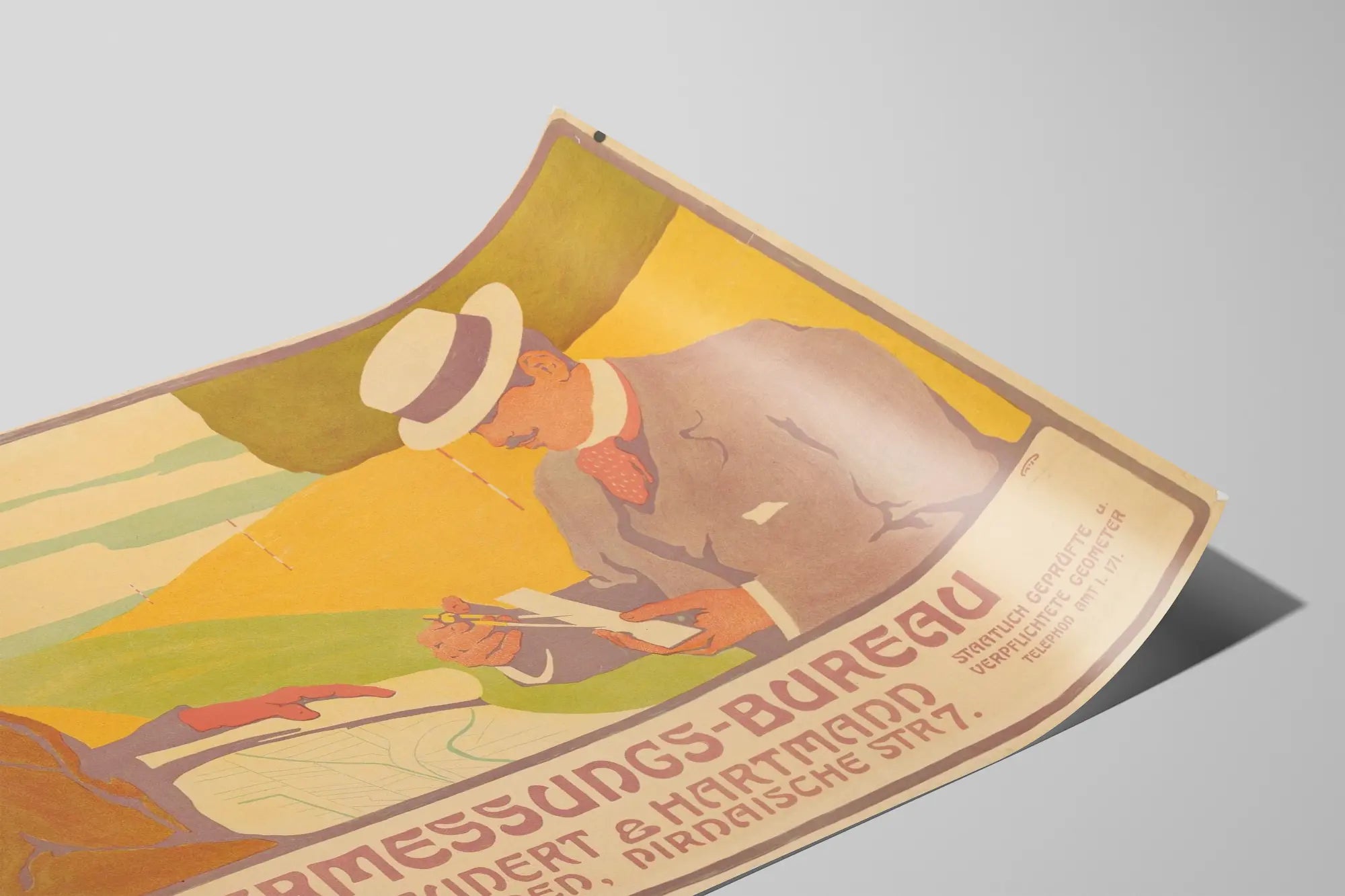Tämä vintage juliste esittää tyylikkään ammatillisen kohtauksen, jossa esitellään Dresdessä sijaitseva Vermessungs-Bureau Grundert & Hartmann. Kuvassa kaksi miestä ovat aktiivisesti kartoitus- tai mittaustyössä, ja tämä seinäkoriste käyttää vanhaa graafista tyyliä, joka on tunnusomaista lämpimille väreille ja yksinkertaistetulle sommittelulle. Vasemmalla oleva mies, pukeutuneena ruskeaan takkiin ja sopivaan hattuun, tutkii suurta karttaa, kun oikealla oleva mies, vaaleassa puvussa ja valkoisessa hatussa, mittaa paperia kompassilla. Taustalla näkyy maaseutumaisema, jossa on polku ja keltaisia sekä oliivinvihreitä mäkiä. Julisteen alaosassa oleva teksti kertoo toimiston erikoisaloista: jakautumiset, kaupunkisuunnitelmien laatiminen ja kiinteistörajat, korostaen huolellista geometria- ja topografiatyötä. Tämä juliste tarjoaa epäilemättä viehätystä seinäkoristeeksi sisätiloihin, jotka haluavat lisätä historiaa ja aitoutta, erityisesti graafisten taiteiden, kartoituksen tai vanhan kuvaston ystäville. Se sopii täydellisesti olohuoneeseen, toimistoon tai kirjastoon, luoden sekä oppineen että taiteellisen tunnelman. Sen retro-tyyli ja selkeä ikonografia kutsuvat mietiskelyyn ja korostavat suunnittelutyön ja sovelletun geometrian merkitystä. Tämä seinäjuliste yhdistää taiteellisen estetiikan ja ammatillisen teeman, ja on ainutlaatuinen kappale rikastuttamaan mitä tahansa sisustustilaa tyylillä ja luonteella.