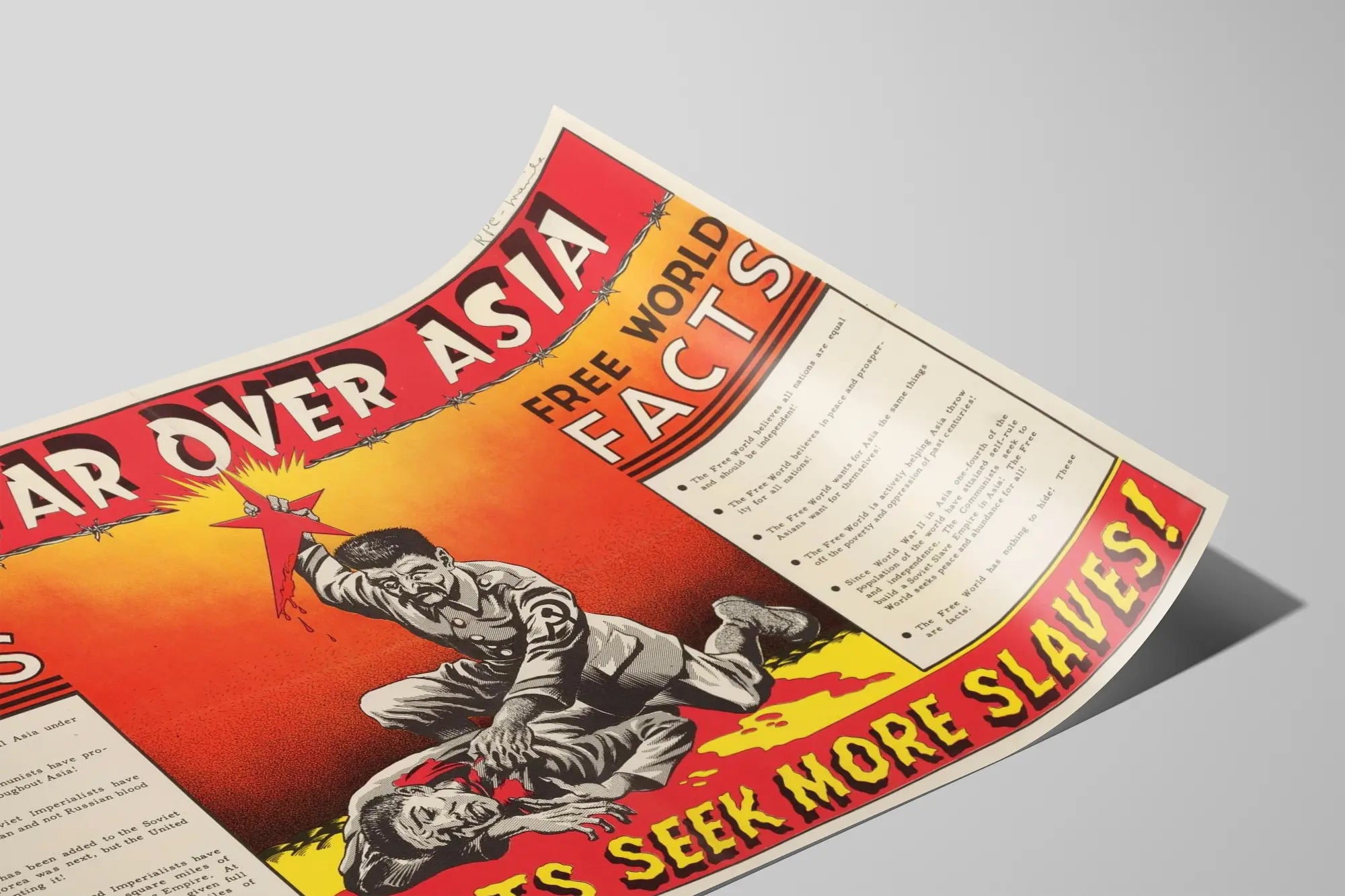 Tämä graafisesti vaikuttava vintage juliste esittää voimakkaan poliittisen viestin, symbolisen taistelun kahden vastakkaisen maailman välillä. Punaisen ja oranssin liukuvärjätyn taustan kanssa tämä seinäkoriste nimeltä "Punainen tähti Aasiassa" esittää dramaattisen kuvan, jossa mieshahmo pitää veristä punaista tähteä maassa olevan toisen henkilön yläpuolella, vahvistaen konfliktin ja sortamisen teemaa. Tämä juliste jakaa visuaalisesti sisältönsä kahteen osaan nimeltä "Orjuuden maailma - Faktat" ja "Vapaa maailma - Faktat", korostaen ideologisia eroja kommunistisen ja vapaan maailman välillä. Tämän julisteen estetiikka heijastaa kylmän sodan propagandatyyliä, rohkeine typografioineen ja kirkkaine väreineen, jotka kiinnittävät huomion. Yläosaa halkoo vaakasuora piikkilanka-elementti, vahvistaen vankeuden ja taistelun teemaa. Tämä juliste on merkittävä seinäkoriste poliittisen historian, retro-grafiikan tai vanhojen julisteiden keräilijöille. Se luo intensiivisen ja narratiivisen tunnelman mihin tahansa tilaan, sopien kehystettynä julisteena tai koristeellisena tauluna, joka korostaa vintage-tyyliä ja sisältää vahvan symbolisen viestin. Korkea kontrasti ja selkeä koostumus tekevät siitä koriste-elementin, joka herättää pohdintaa ja keskustelua, ihanteellinen kulttuuri- tai historiallisten keskustelujen ympäristöihin.