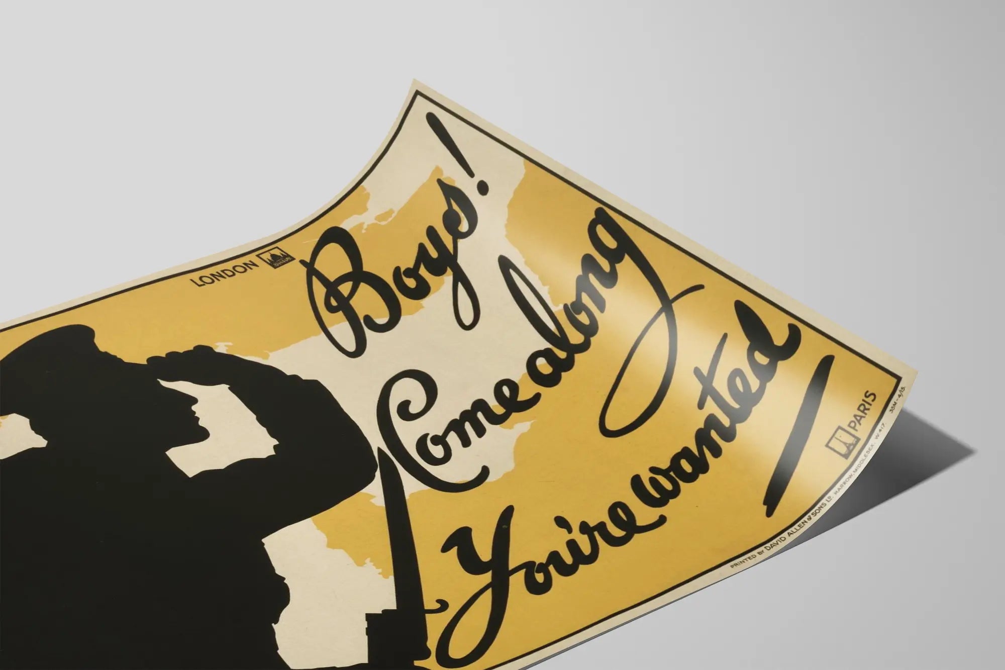 Tämä vintage sotilaspainos esittää mustavalkoisen siluetin sotilaasta, joka on univormussa, kantaa reppua ja kypärää, katsellen horisonttiin käden ojennuksella otsalla. Taustana on tyylitelty keltainen ja valkoinen kartta, joka todennäköisesti kuvaa Iso-Britanniaa. Mustalla käsin kirjoitettu teksti, joka vie suuren osan julisteesta, kehottaa osallistumaan viestillä: « Boys! Come along You're wanted ». Tämä rekrytointijuliste muistuttaa yksinkertaisesta ja kontrastisesta graafisesta tyylistä, joka on ominaista 1900-luvun alun sotilaalliselle propagandajulisteelle. Se edustaa historiallista seinäkoristetta, joka sopii vintage-, sotilas- tai graafisen sisustuksen harrastajille. Tämä juliste erottuu minimalistisella koostumuksellaan ja suoralta vaikuttavalla viestillään, välittäen isänmaallisen tunnelman ja kutsun mobilisaatioon. Täydellinen seinäkoriste retro- tai teollistyyliin sisätiloihin, se tuo aitouden tuntua ja historiallista muistutusta jokaiseen huoneeseen. Tämä juliste voidaan ripustaa toimistoon, kirjastoon tai olohuoneeseen rikastuttamaan tilaa vahvalla ja osallistavalla visuaalisella elementillä. Tämä graafinen taulu yhdistää yksinkertaisuuden ja visuaalisen vaikutuksen, kontrastin korostuessa mustan siluetin ja vaalean taustan välillä, vahvistettuna dynaamisella käsin kirjoitetulla typografialla. Se on seinäkoriste, joka kiinnittää katseen ja herättää pohdintaa alkuperäisestä kontekstistaan, samalla arvostaen ajattoman graafisen tyylin. Sopii vanhojen julisteiden keräilijöille, sotahistorian harrastajille ja kaikille, jotka haluavat rikastuttaa sisustustaan alkuperäisellä ja vaikuttavalla julisteella.