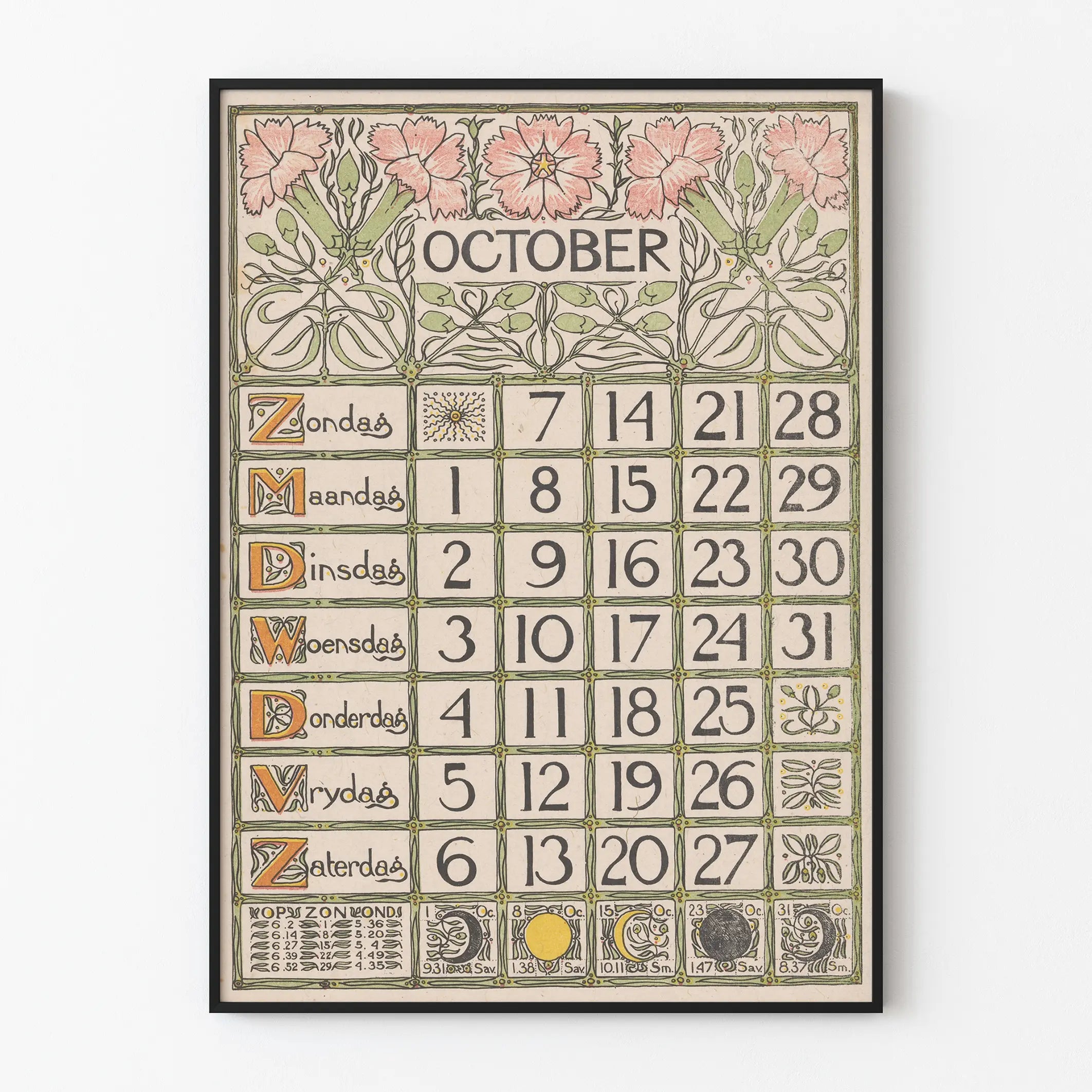 Tämä lokakuun kalenterilista edustaa hienostunutta ja herkkää Art Nouveau -tyyliä. Yläosan kukkamuodostelmat koristavat julistetta tuoden eleganssia ja pehmeyttä, ja niissä on tyyliteltyjä kukkia vaaleanpunaisissa ja vihreissä sävyissä, jotka kehystävät otsikon "OCTOBER" isoilla kirjaimilla. Kunkin päivän numerot on järjestetty ruudukkoon vaalealle taustalle, ja ne on erotettu ohuilla viivoilla, joita koristavat pienet vihreät ja kultaiset yksityiskohdat. Viikonpäivien lyhenteet on kirjoitettu hollanniksi koristeellisella kaunokirjoitustyylillä, ja ne on korostettu huolellisesti työstetyillä isoilla kirjaimilla, mikä lisää tämän seinätaideteoksen vanhaa charmia. Kompositio sisältää myös symbolit, jotka viittaavat kuun vaiheisiin ruudukon alareunassa, sekä lisätietoja numeroiden ja tähtimerkkejen muodossa, mikä vahvistaa tämän seinäkoristeen käytännöllisen ja esteettisen ulottuvuuden. Tämä vintage-juliste kuvastaa täydellisesti ajanhenkeä, jossa kalenteri yhdistyy koristeelliseen taiteeseen, ja sopii erinomaisesti retro-henkeen tai vanhan muotoilun harrastajille. Todellinen graafisen taiteen teos, tämä kalenterilista voidaan käyttää sisustuselementtinä, joka luo elegantin ja historiallisesti arvokkaan tunnelman. Se on täydellinen seinäkoriste toimistossa, kirjastossa tai olohuoneessa, ja viehättää yksityiskohtaisuudellaan, pastellisävyjen harmonialla ja huolellisella typografialla. Tämän julisteen hankkimalla rikastutat asuintilaasi graafisella teoksella, joka muistuttaa 1900-luvun alun estetiikasta, säilyttäen samalla käytännöllisyyden, joka on tyypillistä menneiden aikojen arkipäiväisille esineille. Tämä juliste on erinomainen valinta persoonallisen seinäkoristeen luomiseen, tuoden samalla historiaa ja visuaalista runoutta tilaan.
