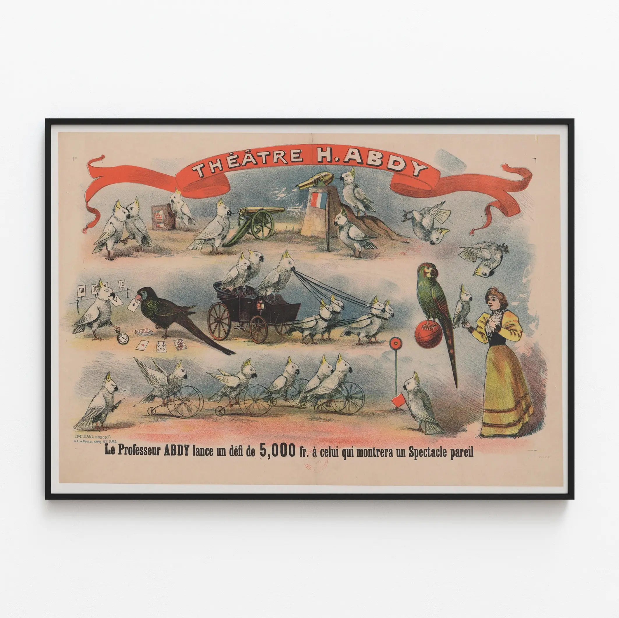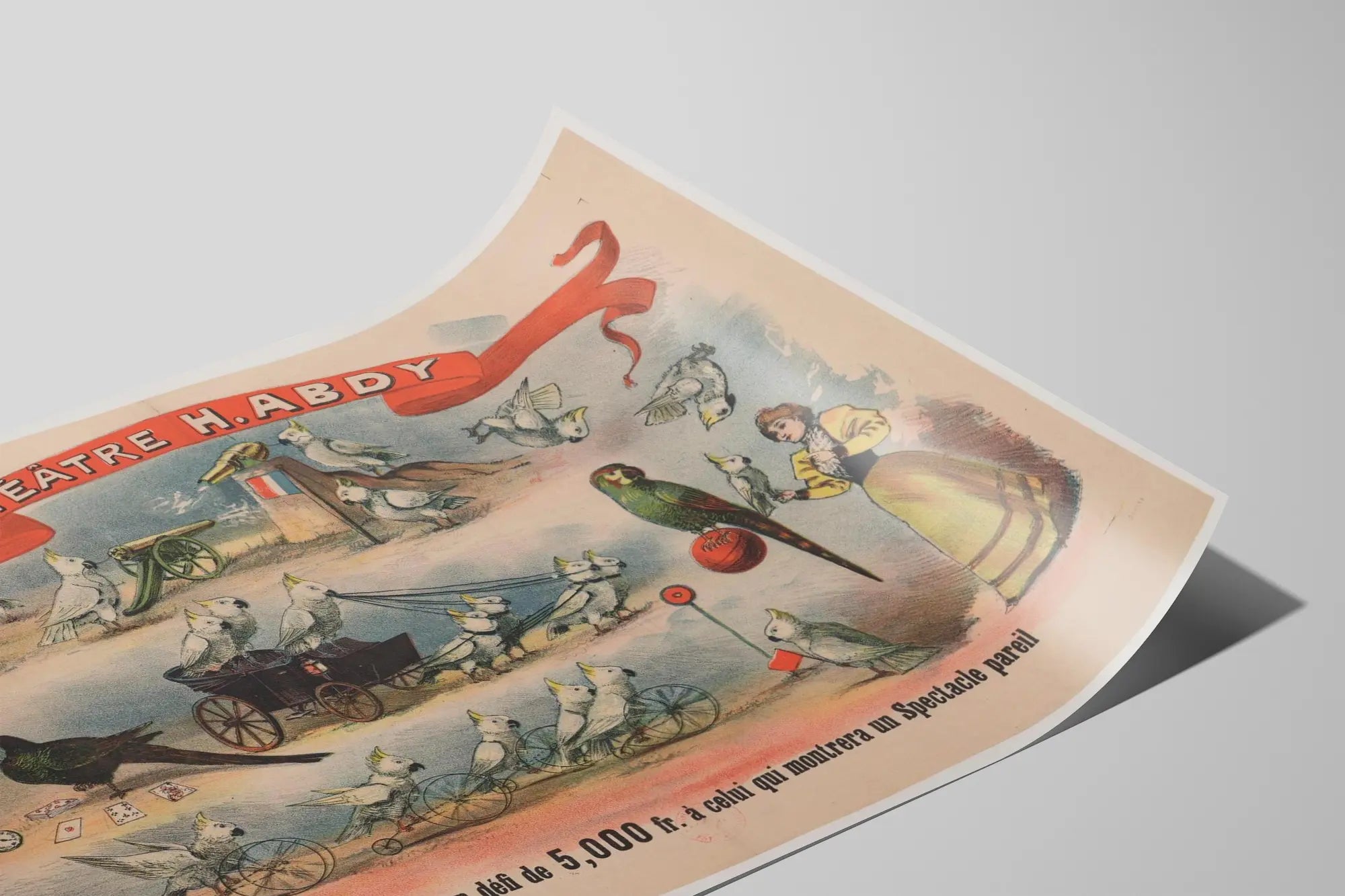 Tämä alkuperäinen vintage juliste H. Abdyn teatterista kuvastaa viehättävästi ennen näkemätöntä esitystä, jossa taitavat papukaijat esittävät erilaisia taiteellisia suorituksia. Piirros esittelee sarjan eloisia kohtauksia, joissa eksoottiset linnut, pääasiassa valkoisia ja värikkäitä papukaijoja, tekevät temppuja ja käsittelevät esineitä, luoden leikkisän ja yllättävän tunnelman. Näkyy muun muassa papukaijoja vetämässä pientä kärryä, leikkimässä korteilla, pyörittämässä pyörää tai pitämässä ranskanlippua kanuunan lähellä, korostaen teatterillista ja omalaatuista lavastetta. Aikakauden asuun pukeutunut nainen, todennäköisesti lintujen hoitaja, on myös läsnä, vahvistaen kohtauksen elävän esityksen vaikutelmaa. Julisteen hallitseva elementti on laaja punainen nauha yläreunassa, jossa lukee teatterin nimi. Alareunassa teksti kehottaa ottamaan vastaan professori Abdyn haastetta, lupaaen 5000 frangin palkinnon kaikille, jotka onnistuvat esittämään vastaavanlaisen näytöksen. Tämä juliste on kaunis esimerkki vintage-seinäkoristeesta, joka viehättää vanhan graafisen taiteen ja teatterijulisteiden ystäviä. Pastellivärien paletti, johon on sekoitettu kirkkaita sävyjä, luo nostalgisen tunnelman, joka sopii sisustukseen retro- ja omalaatuisella vivahteella. Tämä seinäkoriste sopii täydellisesti olohuoneeseen, toimistoon tai yksityiseen teatterisaliin, tuoden eleganssia ja uteliaisuutta eläin- ja teatterimaailman inspiroiman teeman ansiosta. Erinomainen keräilyesine tai vanhojen julisteiden gallerian rikastuttaja, tämä juliste on kutsu sukeltaa uudelleen kiehtovaan menneiden eläinnäytösten maailmaan.