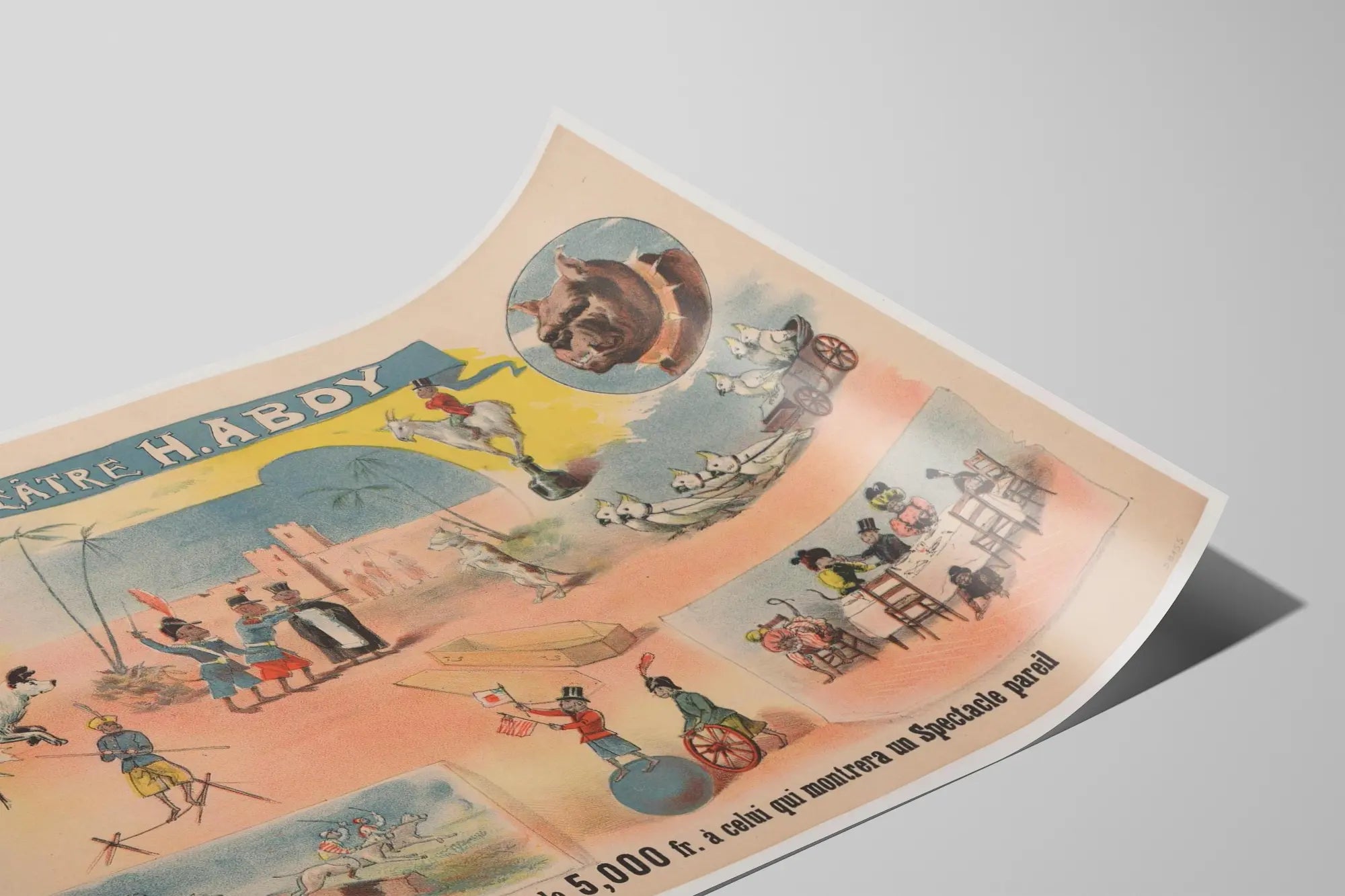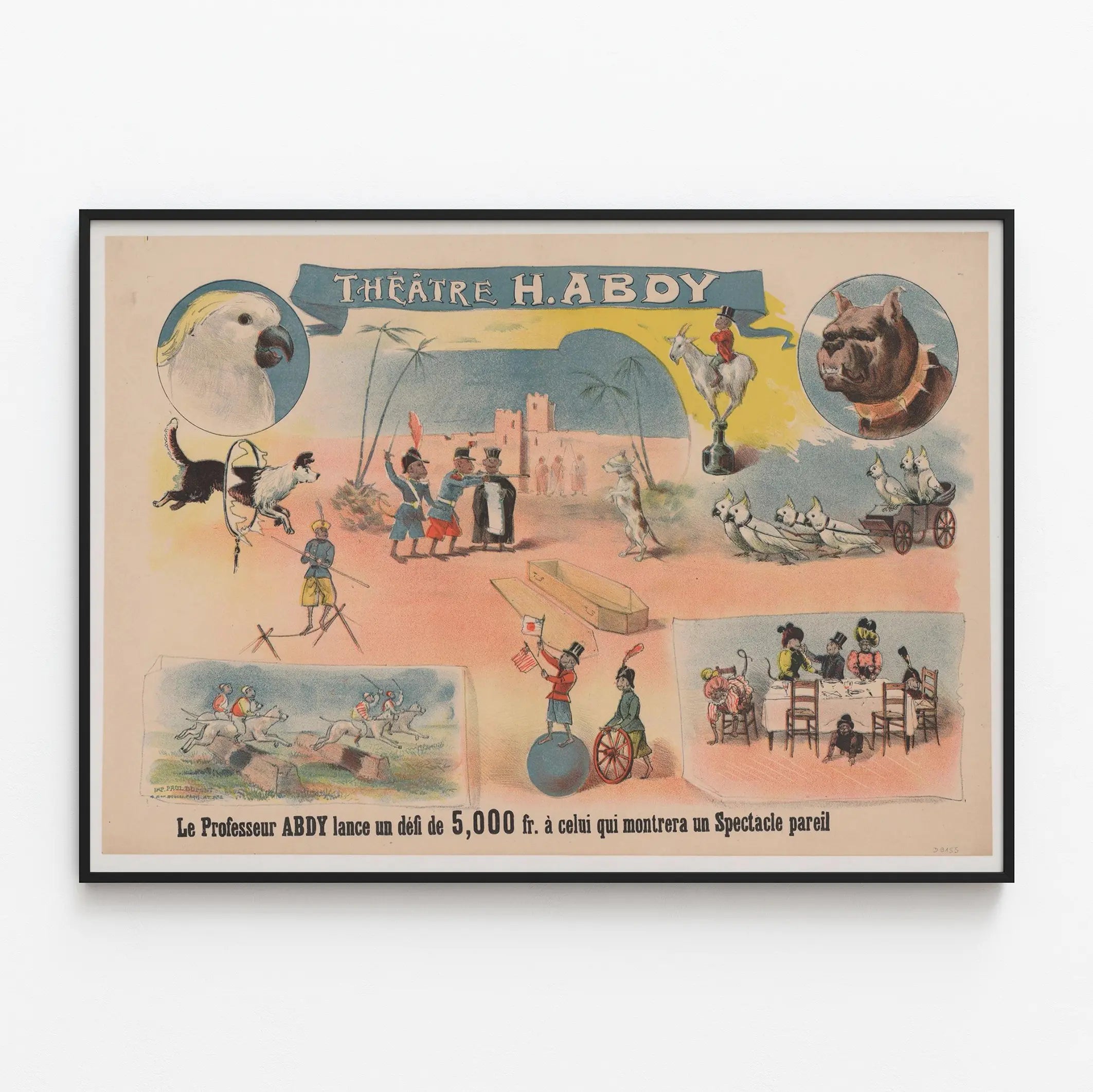 Tämä vintage Juliste on ikoninen osa H-teatterin esitystä, joka kuvaa professori Abdyn haastetta: 5000 frangia kenelle tahansa, joka pystyy esittämään samanlaisen näytöksen. Tämä vanhan tyylinen juliste vangitsee hienovaraisesti ja huumorilla esityksen, jossa yhdistyvät koulutetut eläimet ja näyttävät tempput. Näemme siinä erilaisia teatterin elementtejä, kuten papukaijan, koiran hyppäämässä renkaasta, aikakauden näyttelijöitä puvuissaan, vuohen, jota ohjaa pieni hahmo hatussa, ja useita cockatooja, jotka osallistuvat leikkisään lavastukseen. Tämä värikäs ja herkkä seinäkoriste luo täydellisen tunnelman retro-taiteen ja teatterihistorian ystäville. Juliste tai taiteellinen juliste tuo alkuperäisen ja aitouden vivahteen seinäkoristeluusi. Ihanteellinen olohuoneeseen, toimistoon tai teatterisaliin, tämä kuva kutsuu matkalle ajassa taaksepäin ja kiehtovaan eläinnäytösten ja teatteriesitysten maailmaan. Tasapainoinen sommittelu korostaa hahmojen ja eläinten eloa yksinkertaisessa mutta vaikuttavassa ympäristössä. Tämä painettu taulu tarjoaa kauniin esimerkin teatterilithografiasta, jota käytettiin ainutlaatuisten esitysten mainostamiseen ja juhlistamiseen, samalla kun se koristaa tyylikkäästi seinäsi täynnä historiaa ja luovuutta.