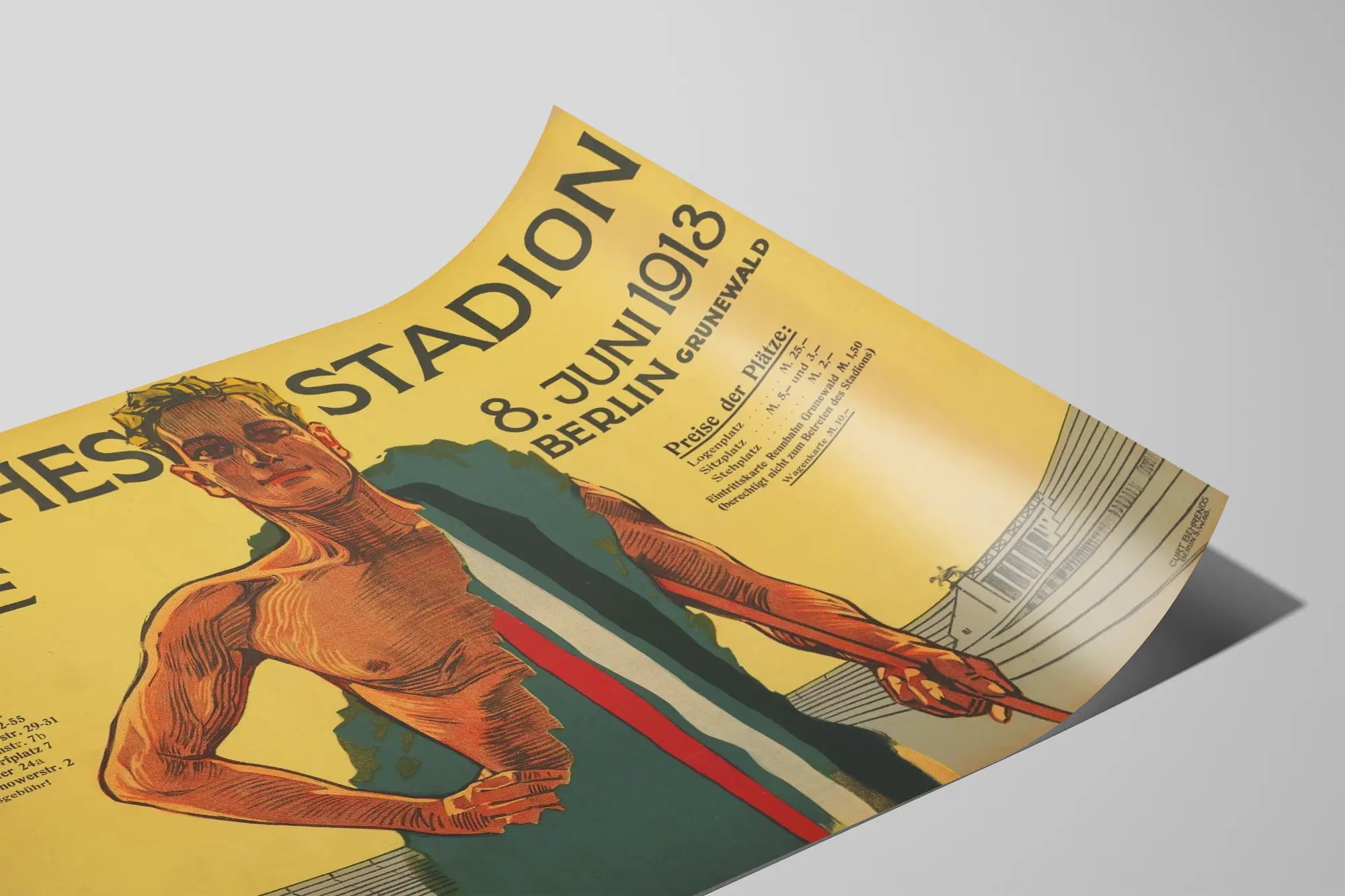 Tämä vintage- juliste on kuvallinen kutsu ensimmäiseen suureen syksyn urheilutapahtumaan Deutsches Stadionilla Berliinissä, päiväykseltään 8. kesäkuuta 1913. Se esittää lihaksikasta urheilijaa paljain ylävartaloin, jossa on kolmivärinen huivi, symboloiden voimaa ja päättäväisyyttä, tyypillisellä 1900-luvun alun graafisella tyylillä. Taustalla piirros hahmottelee stadionin katsomoita ja arkkitehtonisia elementtejä, vahvistaen kilpailun juhlallista tunnelmaa. Tämä juliste on suunniteltu vangitsevaksi seinäkoristeeksi, joka sopii erinomaisesti urheiluhistorian ja retro-grafiikan harrastajille. Sen julistemuoto sopii täydellisesti olohuoneeseen, työhuoneeseen tai kuntosaliin, tuoden tilaan dynaamisuutta ja vanhan ajan muotoilua. Väriteemansa, jossa hallitsevat lämpimät ja maanläheiset sävyt, rikastuttaa tämän ainutlaatuisen kappaleen aitouden tuntua. Tämän julisteen käyttäminen seinäkoristeena mahdollistaa aikakauden urheilukilpailujen hengen elvyttämisen samalla kun sisustaa tyylikkäästi nykyaikaista sisätilaa. Tämä juliste on erinomainen taulu urheilun, retro-taiteen ja saksan historian ystäville. Se korostaa vintage-estetiikkaa ja kertoo voimakkaan visuaalisen tarinan, joka inspiroi motivaatiota ja positiivista energiaa. Täydellinen sisustuselementti urheiluun omistettuun tilaan, keräilyyn tai klubiin – tämä kuva on kaunis kunnianosoitus 1900-luvun alun kilpailujen hengelle.