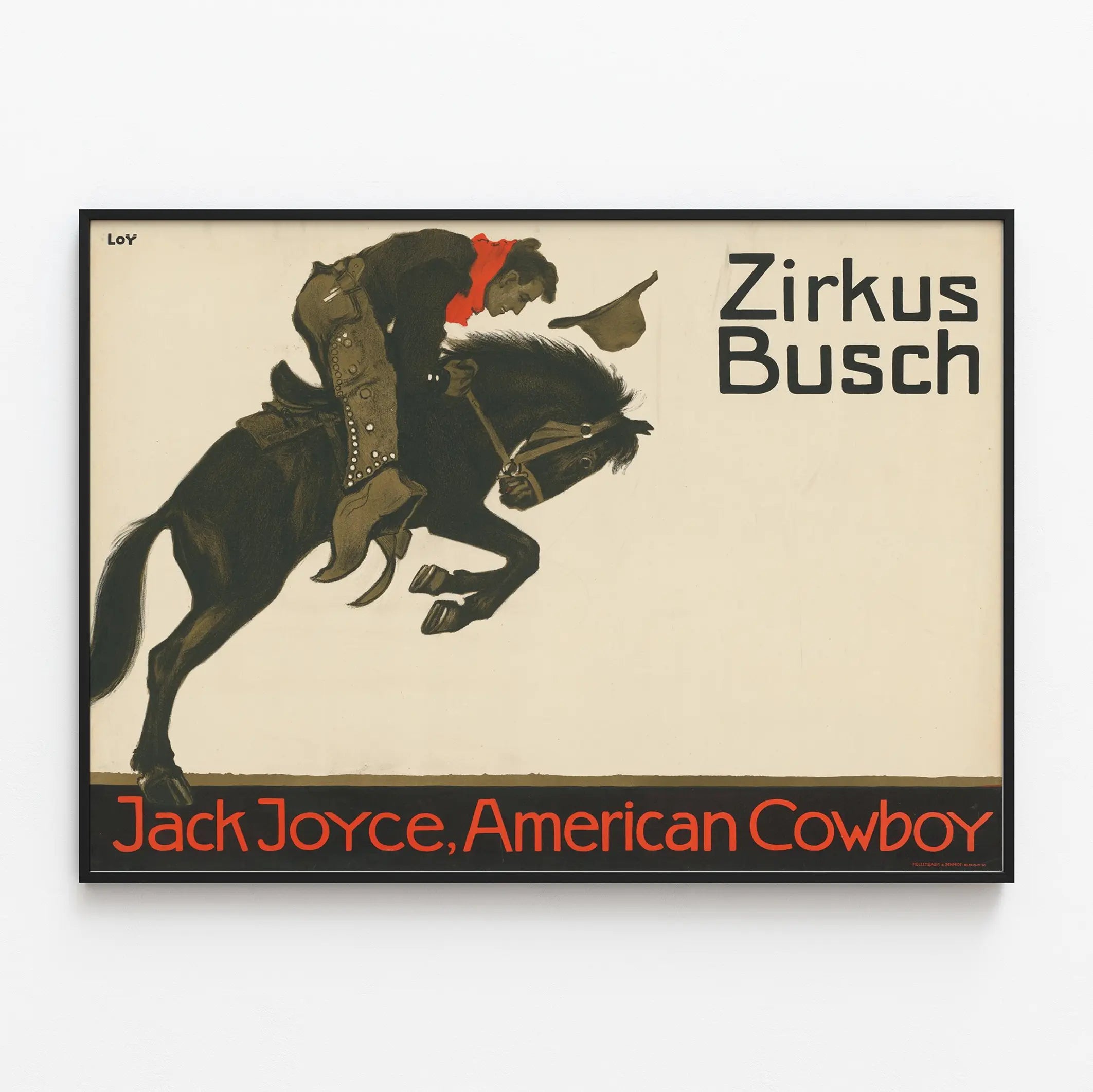 Tämä vintage-tyylinen koristejuliste esittää Jack Joycea, amerikkalaista cowboyta, dynaamisessa ratsastusasennossa, valmiina hyppäämään. Zirkus Busch -nimen signeeraama seinäkoriste vangitsee sirkuksen ja lännen hengen yksinkertaisella grafiikalla ja hillityllä väripaletilla, johon hallitsevat musta, punainen ja beige. Cowboy, pukeutuneena mustaan paitaan ja kirkkaan punaiseen huiviin, nostaa lakkiaan ilmeikkäällä eleellä, kun taas hänen hevosensa näyttää pysäytetyltä liikkeessä, vahvistaen energiaa ja vauhtia. Tämä seinäjuliste on ihanteellinen retro-tyylisen tai lännen teemaisen sisäseinäkoristeen luomiseen, tuoden taiteellista ja vintage-henkeä olohuoneeseen, toimistoon tai vapaa-ajan tilaan. Suuren kokoinen kuva-alue kattaa suuren osan tilasta, korostaen ratsastajan ja hänen ratsunsa yksityiskohtaista siluettia hillityn taustan vasten, jossa yläoikealla näkyy teksti "Zirkus Busch" ja alhaalla "Jack Joyce, American Cowboy", kirjoitettuna erottuvalla mustan ja punaisen värin typografialla. Värien yksinkertaisuus ja epäsymmetrinen sommittelu lisäävät tämän vintage-julisteen visuaalista vaikutusta, tehden siitä sopivan niin yksittäiseen näyttelyyn kuin kokonaiseksi seinäkoristeeksi sirkuksen tai cowboy-hengen teemaan. Seinäsomisteena tämä juliste voi muodostua huoneen keskipisteeksi, vahvistaen sekä kansainvälistä että historiallista tunnelmaa ja juhlistaen cowboy-hahmoa kulttuurisenä ikonina. Graafisen tyylinsä ja aiheen ansiosta tämä juliste sopii täydellisesti vintage-seinätaiteen kokoelmaan tai matkailuesityksestä ja amerikkalaisista legendoista inspiroituun sisustukseen. Se on ainutlaatuinen koriste-esine, täydellinen vanhojen julisteiden harrastajille, sirkushistorian ystäville tai niille, jotka haluavat personoida tilan vanhan ajan viehätyksellä.