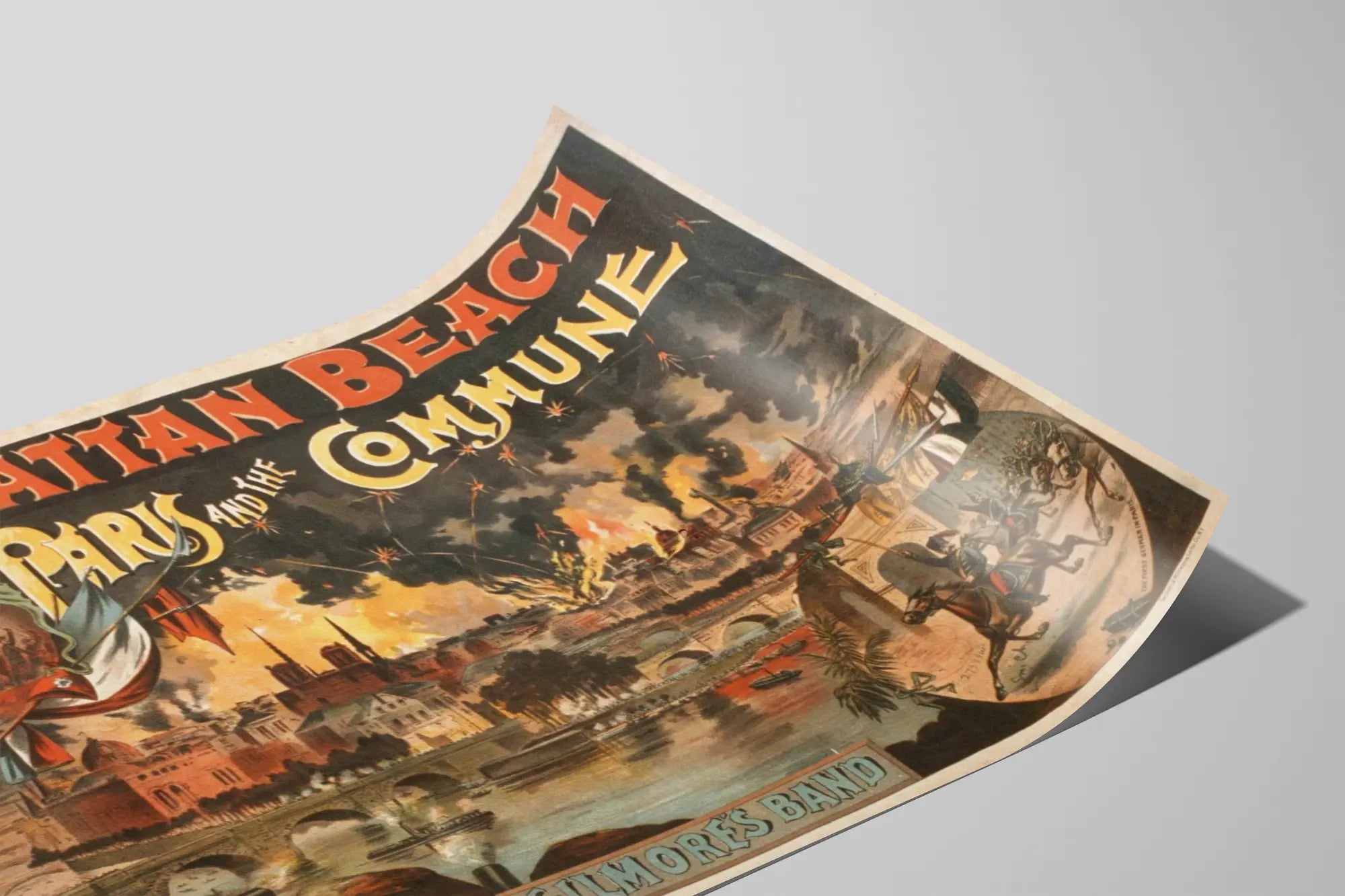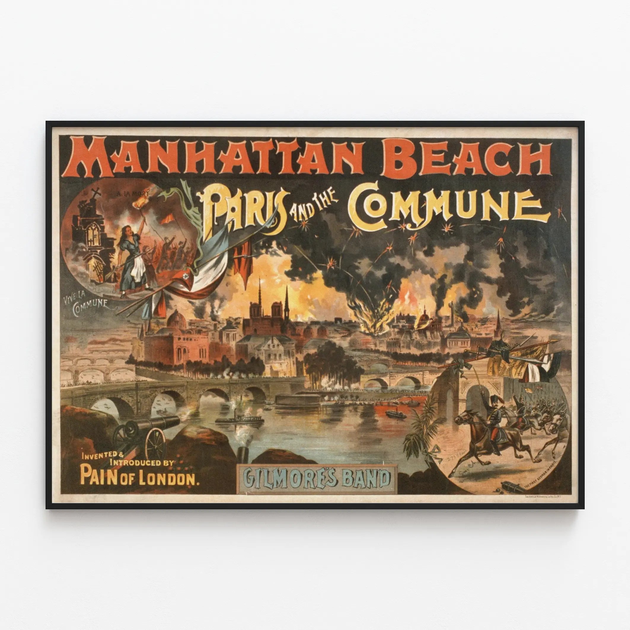 Tämä vintagejuliste nimeltä « Manhattan Beach Paris and the Commune » on vanhan ja vaikuttavan tyylin seinäkoriste. Se esittää dramaattisen kohtauksen Pariisista liekeissä, ikonisten rakennusten ja siltojen yli virtaavan joen äärellä, savun ja räjähdysten peittämässä taivaassa. Keskellä päähuomion kiinnittää kirkkaiden värejen typografia, jossa yhdistyvät syvä punainen ja kultainen keltainen, kun taas julisteen yläosassa selkeä ja vaikuttava teksti korostaa otsikkoa.