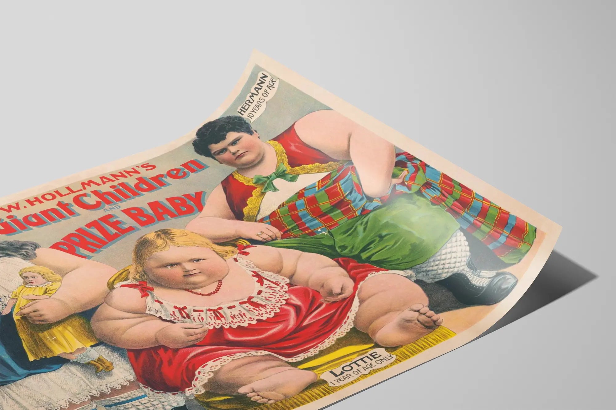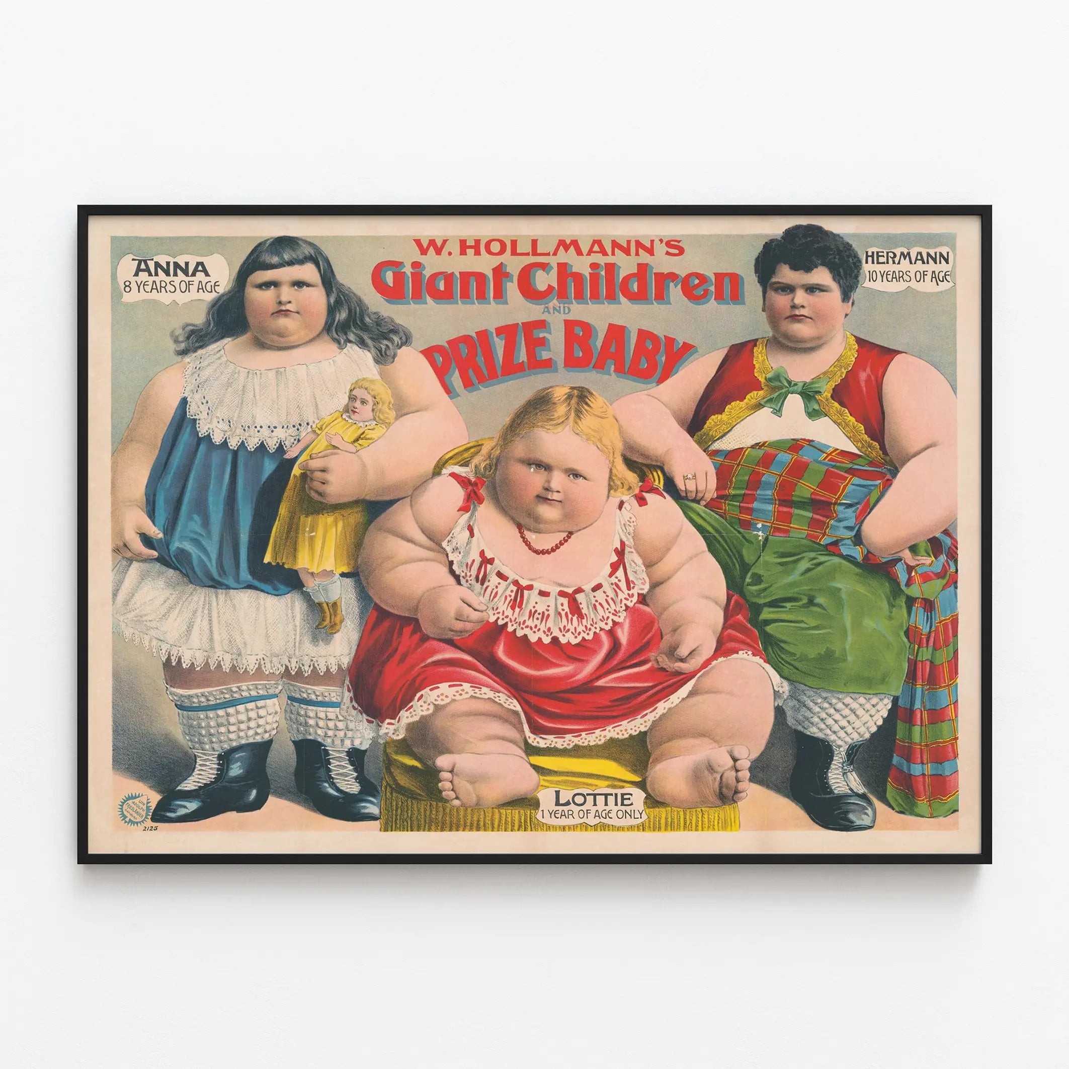 Tämä vintage juliste herättää kysymyksiä ja pohdintaa tivoliesityksistä tai markkinoista menneinä aikoina, joissa näitä poikkeuksellisia lapsia saattoi esitellä. Sen viehätys piilee sekä visuaalisessa vaikutuksessa että sisäisessä narratiivisessa ulottuvuudessa, mikä herättää uteliaisuutta kyseisestä ajasta ja näistä hahmoista.