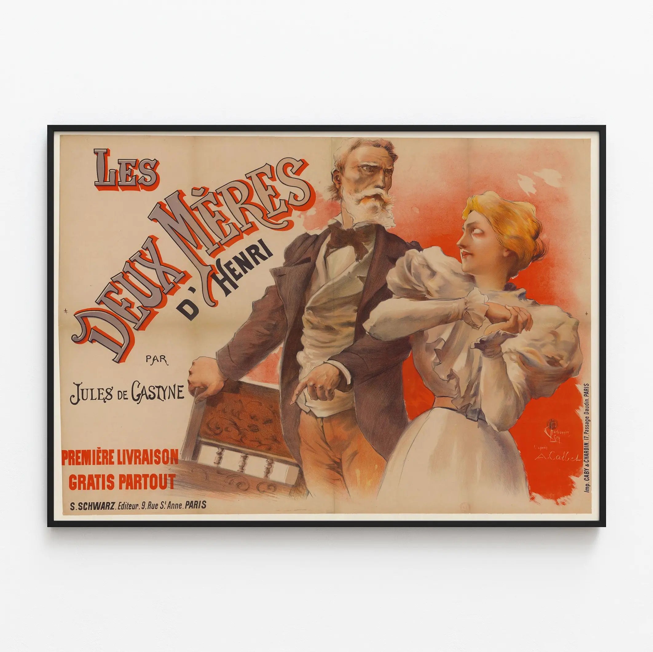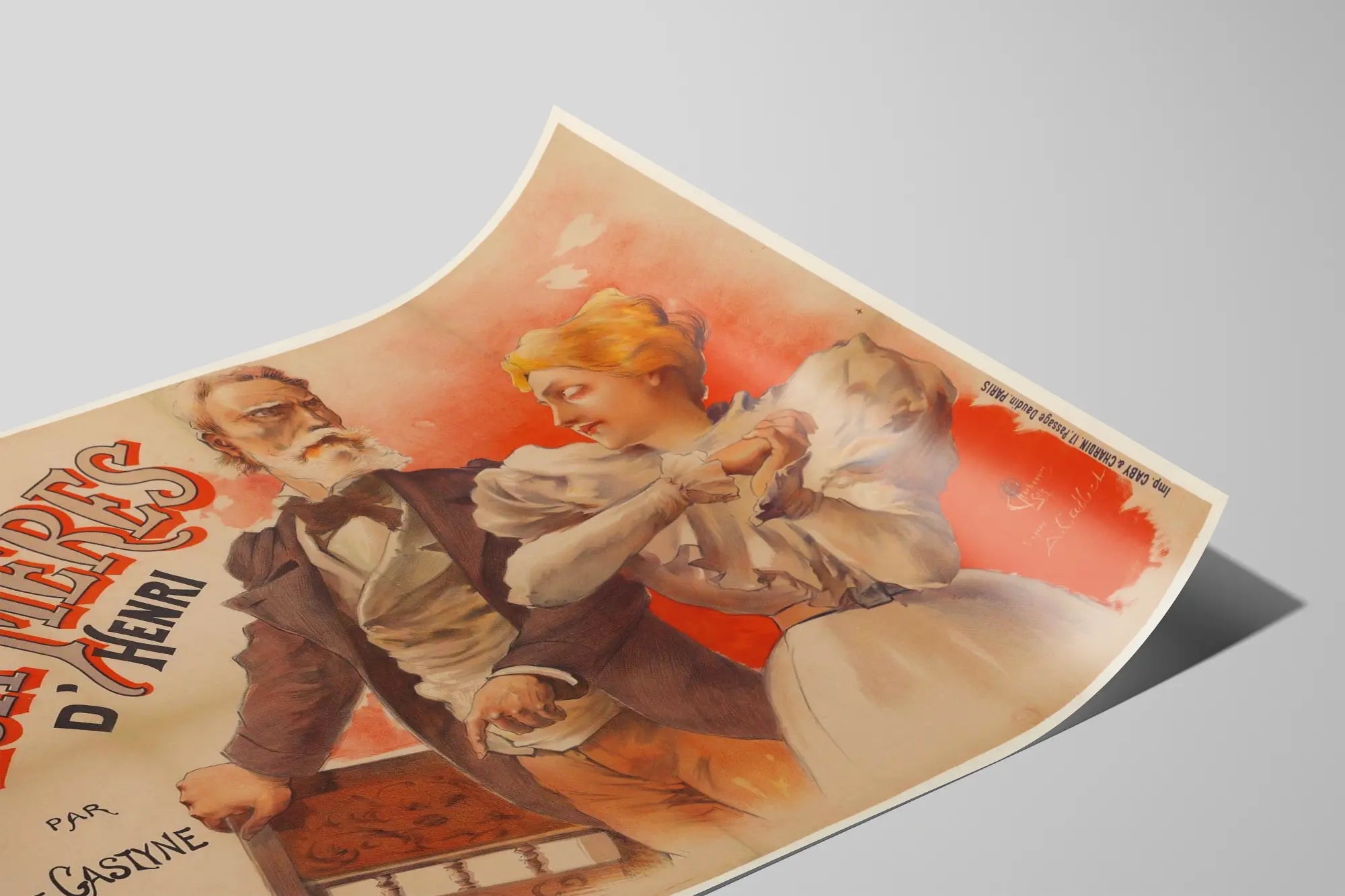 Tutustu tähän alkuperäiseen vintage-plakaattiin nimeltä « Les Deux Mères d'Henri », jonka on tehnyt Jules de Gastyne. Erityisen graafisen tyylinsä ja ilmaisevan sommittelunsa ansiosta tämä seinäkoriste tuo taiteen ja historian tunnelmaa kotiisi. Tämä litografialla painettu juliste esittää kahta naispuolista hahmoa ja vanhuksen, jotka ovat jännityksen ja luonteen täyttämiä asentoja, viitaten draamaattiseen kertomukseen. Lämmintä sävyä hallitseva, erityisesti oranssinpunainen tausta, vahvistaa kohtauksen intensiteettiä. Tämä teos edustaa tyypillistä 1900-luvun alun taiteellista tyyliä, yhdistäen hienostunutta piirustustapaa ja hallittua väritystä, mikä tekee siitä ihanteellisen retro- ja tyylikkään seinäkoristeen. Olipa kyseessä makuuhuone, olohuone tai toimisto, tämä juliste lisää tilaan teatraalisen ja historiallisen tunnelman. Julisteessa on myös painatus- ja julkaisumerkinnät, jotka todistavat sen aitouden ja alkuperäisen valmistustavan. Hanki tämä seinäkoriste rikastuttaaksesi vanhojen julisteiden kokoelmaasi tai koristellaksesi seinäsi taiteellisella esineellä, joka huokuu luonnetta.