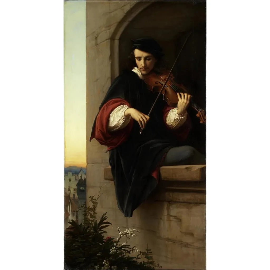 Kohteessa "Violinisti kellotorin ikkunassa" Eduard von Steinle kuljettaa meidät hetkeen, jossa vallitsee rauha ja pohdinta. Maalaus kuvaa muusikkoa, joka on hukkunut musiikkiinsa ja soittaa intohimoisesti kellotorin ikkunassa. Pehmeät värit ja valon leikit luovat intiimin, lähes taianomaisen tunnelman, jossa ääni tuntuu kaikuvan yli kankaan. Sävellyksen, tasapainoisen harmonian sisä- ja ulkotilan välillä, kutsuu katsojan kuvittelemaan itsensä tähän pysäytettyyn hetkeen, jossa musiikki ja taide kohtaavat.