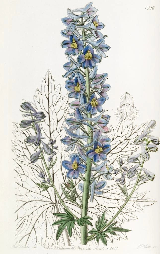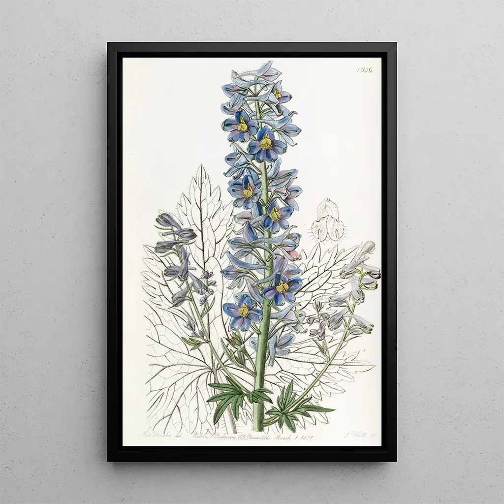 Taidegrafiikka Delphinium des montagnes Sydenham Edwardsilta on todellinen juhlinta alppiluonnosta. Kukkien sinisten ja violetin sävyjen kontrasti ympäröivien lehtien kirkkaiden vihreiden kanssa luo elävän ja dynaamisen tunnelman. Vesiväritekniikka, jota käytetään hienovaraisesti, mahdollistaa lehtien hienostuneisuuden vangitsemisen samalla, kun se antaa kokonaisuudelle vaikuttavan syvyyden. Teos kutsuu rauhalliseen pohdiskeluun, kuljettaen katsojan vuorten sydämeen, missä luonnonkauneus kukoistaa kaikessa loistossaan.