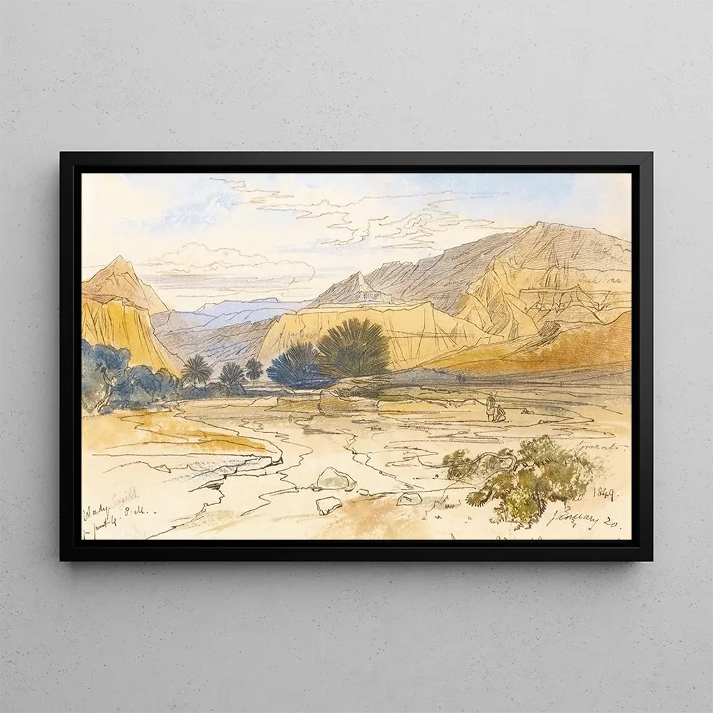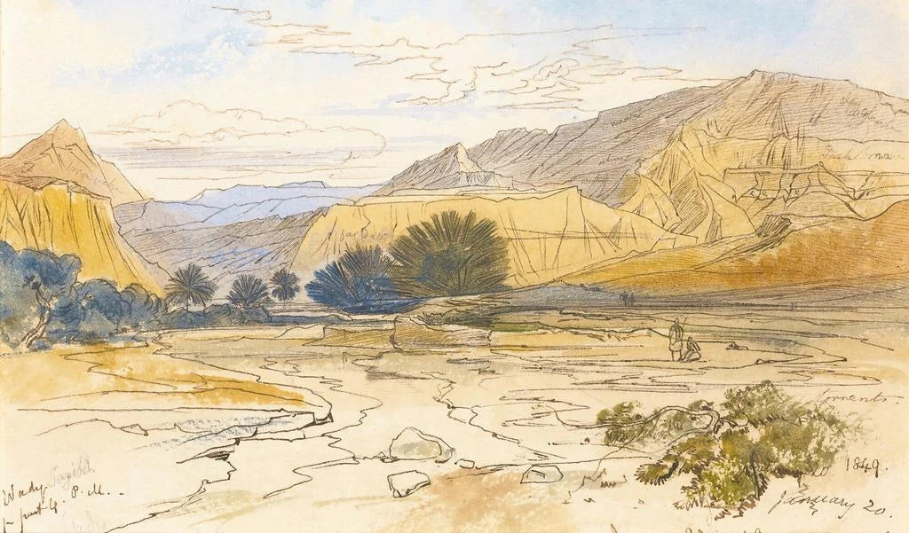 Edward Lear est souvent considéré comme l'un des précurseurs du paysage romantique, ayant voyagé à travers l'Europe et le Moyen-Orient pour capturer la beauté des lieux qu'il visitait. Sa technique de peinture à l'aquarelle, combinée à un sens aigu de l'observation, lui a permis de créer des œuvres qui sont à la fois réalistes et poétiques. Lear a été influencé par les paysages qu'il a découverts, et "Wadi Tayibeh" en est un parfait exemple, reflétant son amour pour la nature et son désir de partager sa vision du monde. Son travail continue d'inspirer les artistes et les amateurs d'art à travers le temps.