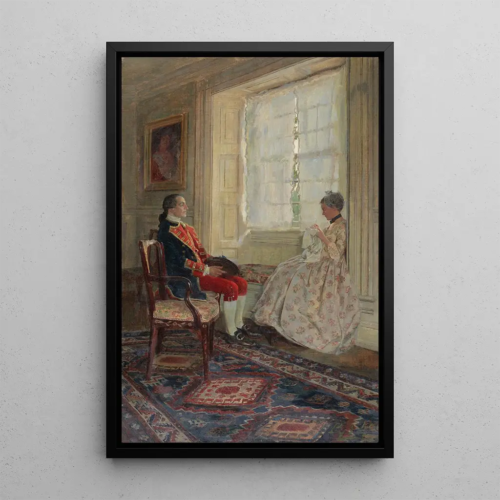 Tässä taidegrafiikka-versiossa "Washington ja Mary Philipse" -maalauksesta Howard Pyle tallentaa intiimin ja tunteisiin vetoavan kohtauksen. Pehmeät värit ja valon leikit korostavat kahden henkilön välistä hellyyttä, samalla viitaten heidän aikansa historiallisesti merkittävään kontekstiin. Pyle:n tekniikka, joka yhdistää tarkkuuden ja herkkyyden, mahdollistaa syvällisen tunteiden kokemisen, jotka heitä yhdistävät. Asusteiden ja tarvikkeiden yksityiskohdat lisäävät visuaalista rikkautta, tehden tästä teoksesta sekä romanttisen että historiallisesti arvokkaan, todellisen todistuksen amerikkalaisesta siirtomaa-ajasta.
