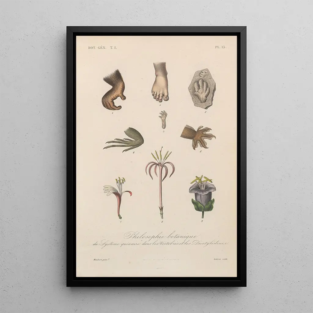 Traité de botanique générale Pl013 -taidegrafiikan uudelleenluomus sukeltuu värien ja tekstuurien rikkaaseen maailmaan. François Hérincq, poikkeuksellisen lahjakas, onnistuu esittämään kasvien muotojen monimutkaisuuden poikkeuksellisella hienostuneisuudella. Kukkien ja lehtien hienovaraiset sävyt kietoutuvat toisiinsa, luoden visuaalisen harmonian, joka houkuttelee katsetta. Jokainen yksityiskohta on huolellisesti suunniteltu, tarjoten sekä rauhoittavan että kiehtovan tunnelman. Tämä teos, taiteen ja tieteen risteyksessä, kutsuu meitä arvostamaan luonnon kauneutta uudesta näkökulmasta.