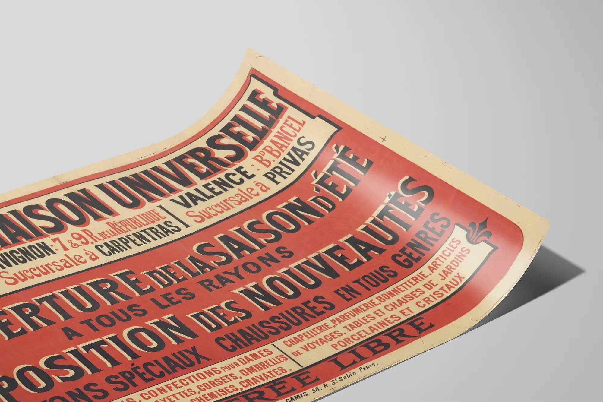 Tutustu tähän alkuperäiseen vintage-mainostauluun nimeltä "Maison Universelle Maube Aîné", ainutlaatuinen elementti seinäkoristeeseesi. Se juhlistaa kesäsesongin avautumista esittelemällä uutuuksia kaikilla osastoilla. Tämä vanha mainostaulu, jonka taustaa hallitsevat punaisen ja kermaisen sävyt, esittelee voimakkaan ja kontrastisen typografisen suunnittelun, joka on täydellinen tuomaan autenttista retro-tyyliä sisätiloihisi. Juliste korostaa eri toimipisteitä Avignonissa, Carpentrasissa, Valenciassa ja Privassa, sisältäen kaupallisia tietoja erikoisosastoista kuten kengistä, muodoista ja nauhoista, naisten ja lasten vaatteista, alusvaatteista, korseteista, varjostimista sekä huonekalutarvikkeista, paidasta, solmioista, hattuliikkeestä, parfyymeistä, sukkahousuista ja paljon muuta. Tämä taulu esittelee myös kodin ja sisustuksen esineitä, kuten posliini- ja kristallipuutarhapöytiä ja tuoleja, korostaen tarjonnan monipuolisuutta. Sen vanha graafinen tyyli, jossa varjostukset leikkivät kirjaimissa, muistuttaa aikaa, jolloin julisteet olivat suosittu viestintäkeino, tehden siitä täydellisen vintage- tai teollisuusilmeen luomiseen. Tämä juliste on erinomainen koristevalinta historian ystäville, vanhojen mainostaulujen keräilijöille ja autenttiselle seinäkoristeelle. Tulosta se ja korosta seinäsi tämän kaupunkihistorian palan avulla, yhdistäen viehätystä ja aikakauden eleganssia.